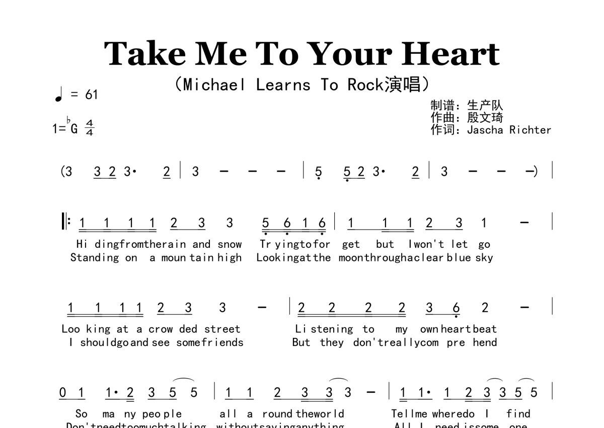 《Take Me To Your Heart》是Michael Learns To Rock演唱的一首歌曲,原版简谱,拍号为4/4拍,歌曲速度为每分钟61拍,这份简谱共有两张高清图谱,图谱由 @生产队 编配上传。