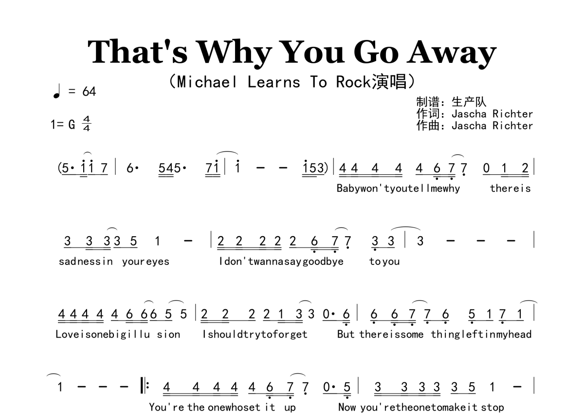 《That's Why You Go Away》是Michael Learns To Rock演唱的一首歌曲,原版简谱,拍号为4/4拍,歌曲速度为每分钟64拍,这份简谱共有两张高清图谱,图谱由 @生产队 编配上传。
