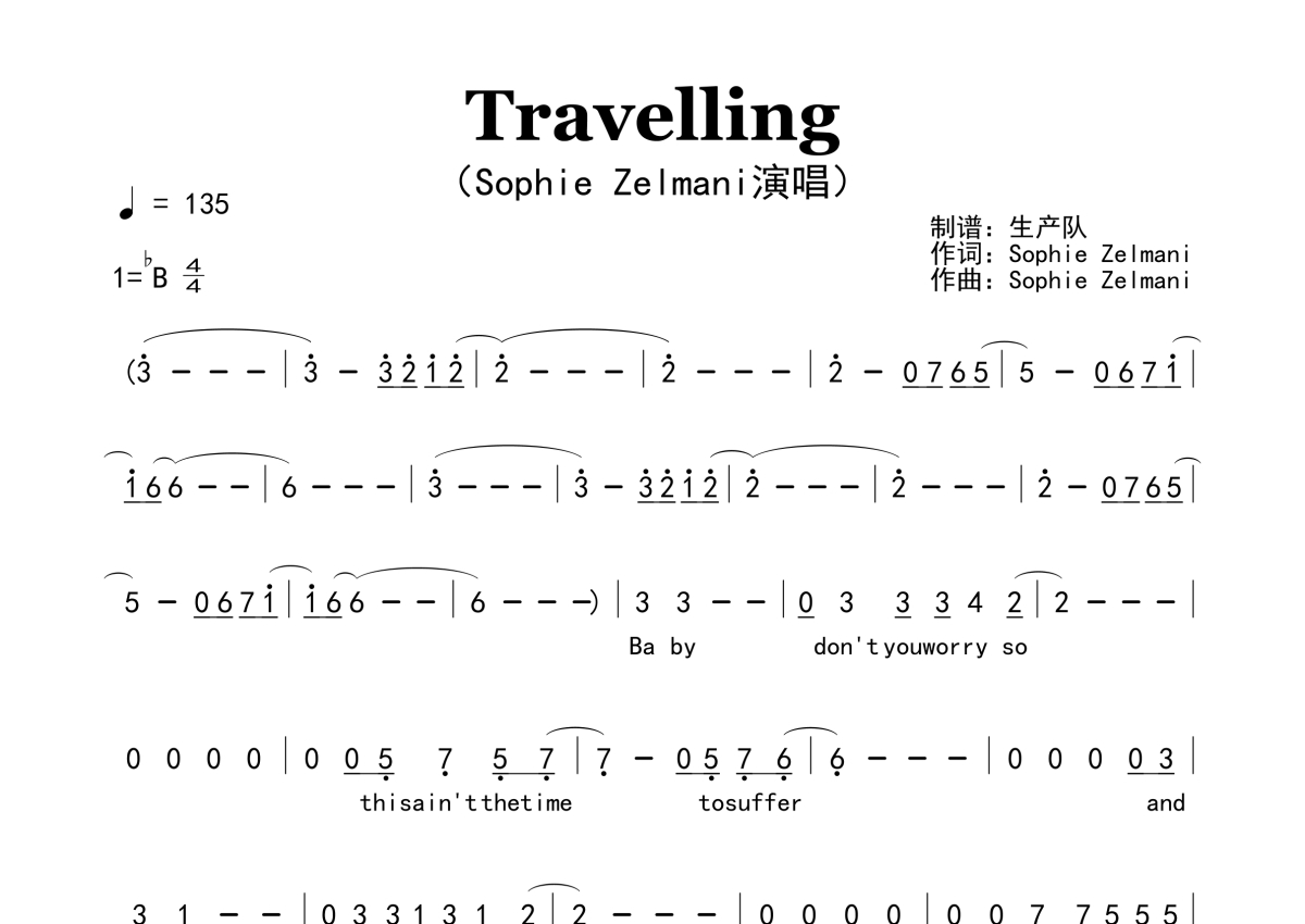 《Travelling》是Sophie Zelmani演唱的一首歌曲,原版简谱,拍号为4/4拍,歌曲速度为每分钟135拍,这份简谱共有两张高清图谱,图谱由 @生产队 编配上传。
