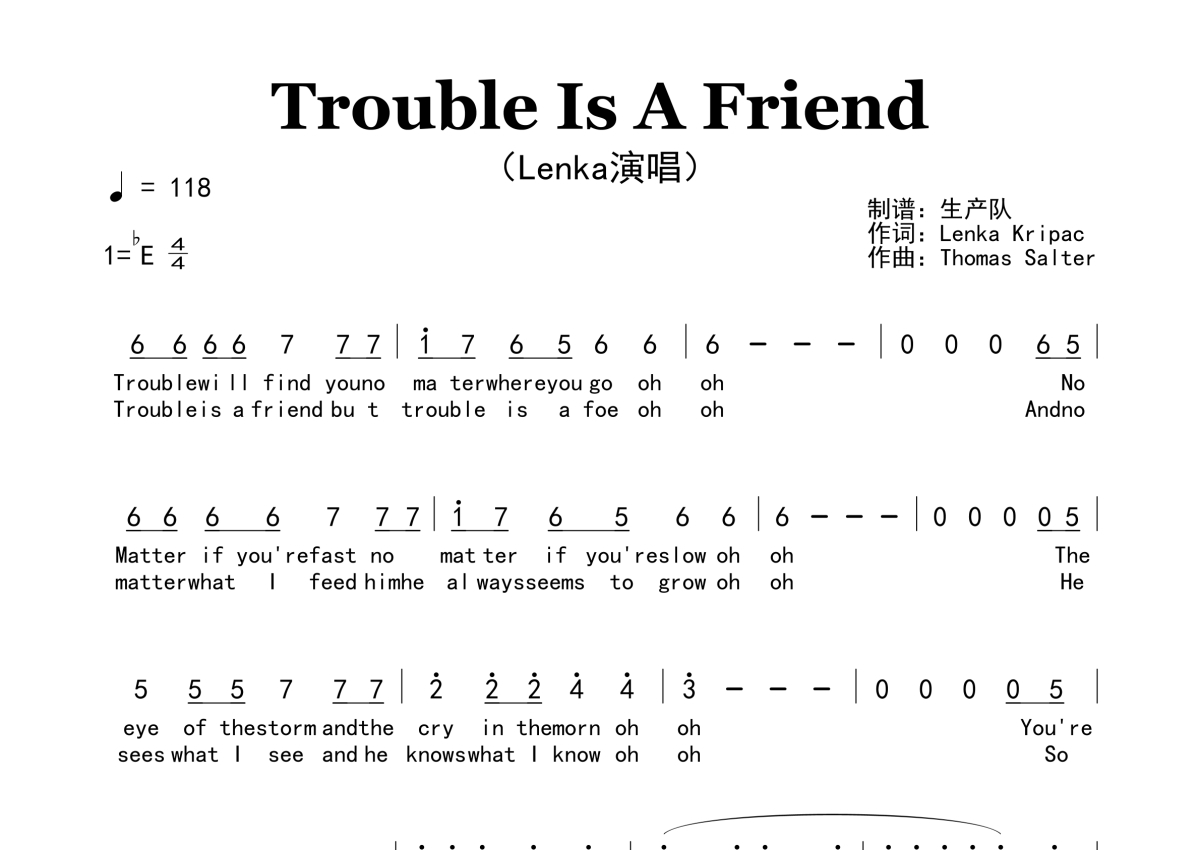 《Trouble Is A Friend》是Lenka演唱的一首歌曲,原版简谱,拍号为4/4拍,歌曲速度为每分钟118拍,这份简谱共有两张高清图谱,图谱由 @生产队 编配上传。