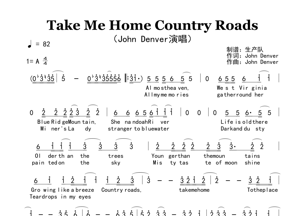 《Take Me Home Country Roads》是John Denver演唱的一首歌曲,原版简谱,拍号为4/4拍,歌曲速度为每分钟82拍,这份简谱共有一张高清图谱,图谱由 @生产队 编配上传。