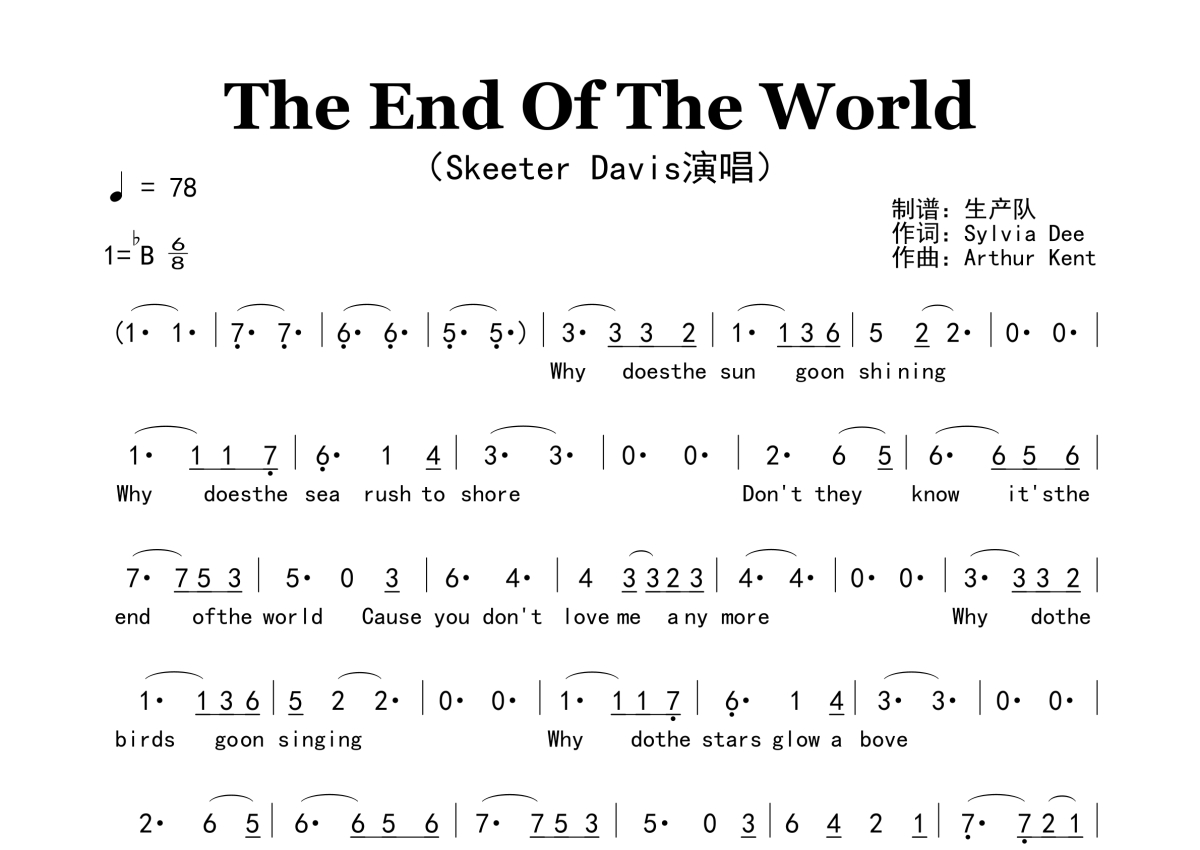 《The End Of The World》是Skeeter Davis演唱的一首歌曲,原版简谱,拍号为6/8拍,歌曲速度为每分钟78拍,这份简谱共有一张高清图谱,图谱由 @生产队 编配上传。