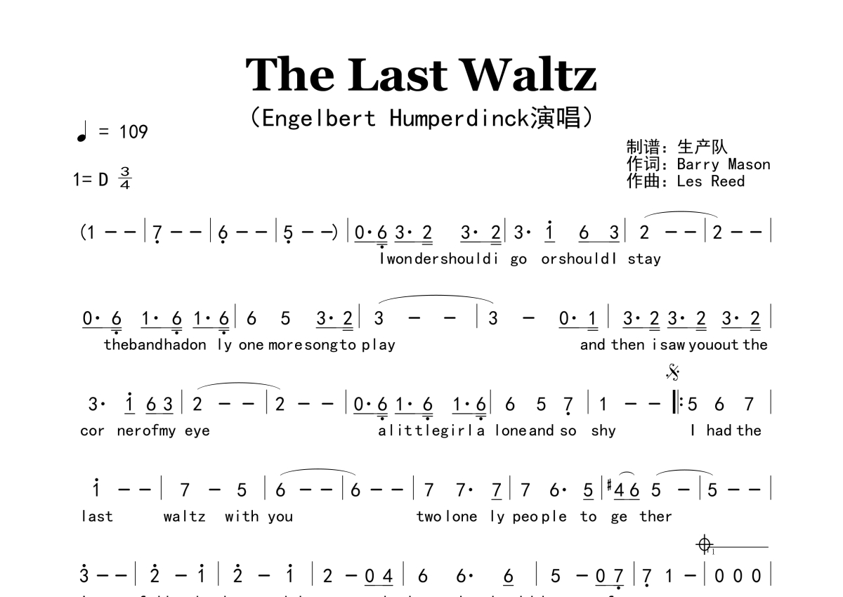《The Last Waltz》是Engelbert Humperdinck演唱的一首歌曲,原版简谱,拍号为3/4拍,歌曲速度为每分钟109拍,这份简谱共有一张高清图谱,图谱由 @生产队 编配上传。