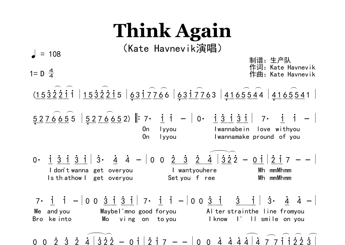 《Think Again》是Kate Havnevik演唱的一首歌曲,原版简谱,拍号为4/4拍,歌曲速度为每分钟108拍,这份简谱共有一张高清图谱,图谱由 @生产队 编配上传。