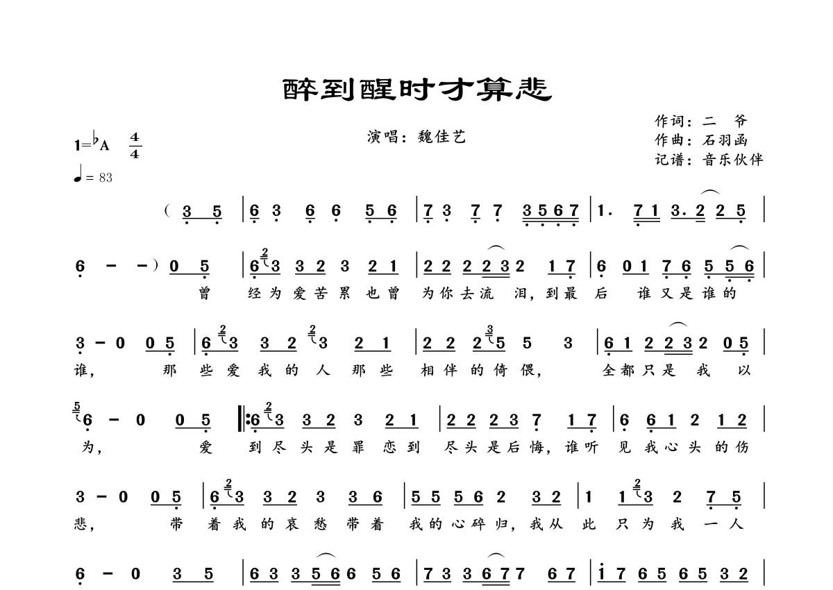 《醉到醒时才算悲》是魏佳艺演唱的一首歌曲,拍号为4/4拍,歌曲速度为每分钟83拍,这份简谱共有一张高清图谱,图谱由 @音乐伙伴 编配上传。