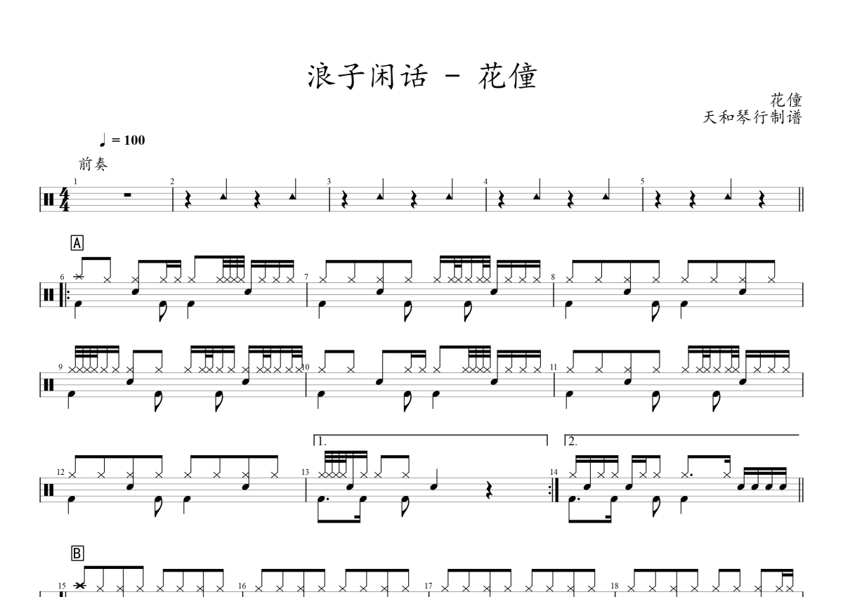 《浪子闲话》是花僮演唱的一首歌曲,拍号为4/4拍,歌曲速度为每分钟100拍,这份架子鼓谱共有两张高清图谱,图谱由 @音符喷血者 编配上传,图谱使用五线谱编配,使用这份浪子闲话架子鼓谱,你将能够轻松地敲打出这首花僮的浪子闲话,快来尝试吧。