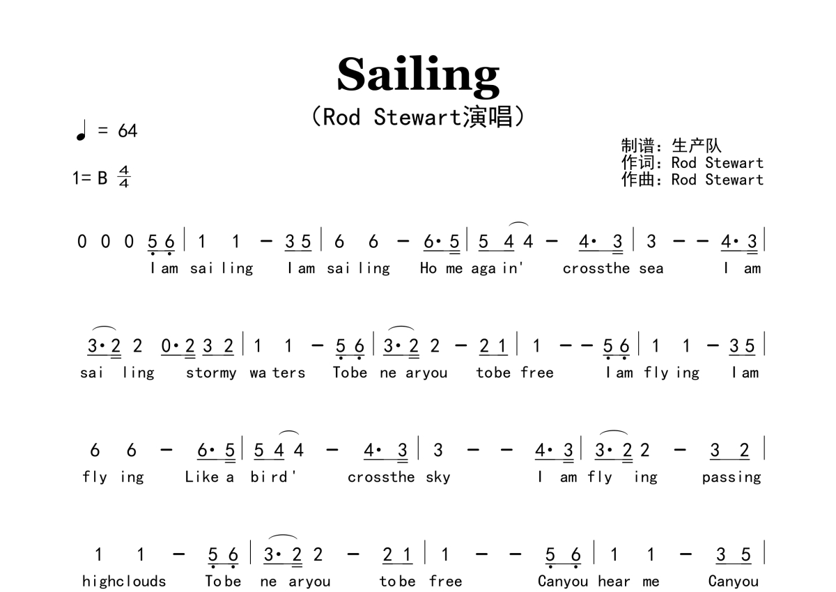 《Sailing》是Rod Stewart演唱的一首歌曲,原版简谱,拍号为4/4拍,歌曲速度为每分钟64拍,这份简谱共有两张高清图谱,图谱由 @生产队 编配上传。