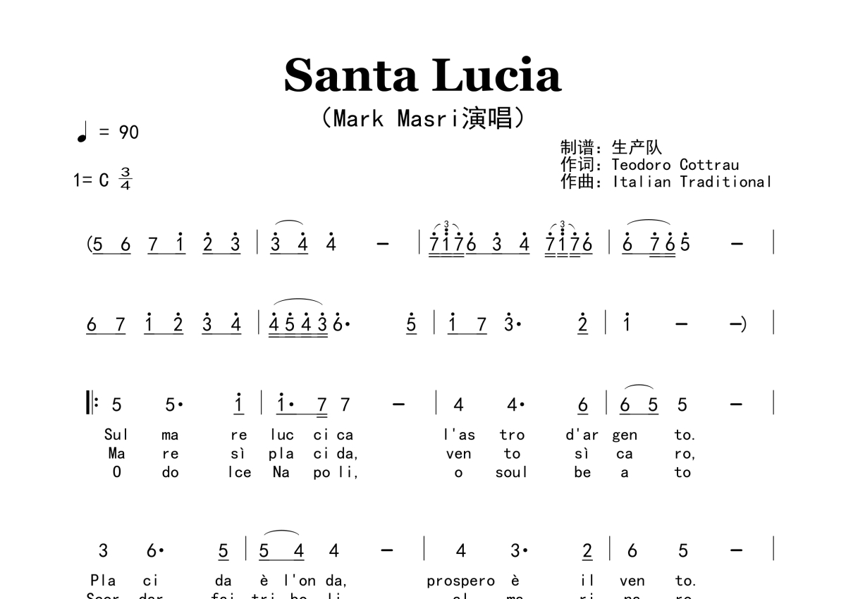 《Santa Lucia》是Mark Masri演唱的一首歌曲,原版简谱,拍号为3/4拍,歌曲速度为每分钟90拍,这份简谱共有两张高清图谱,图谱由 @生产队 编配上传。