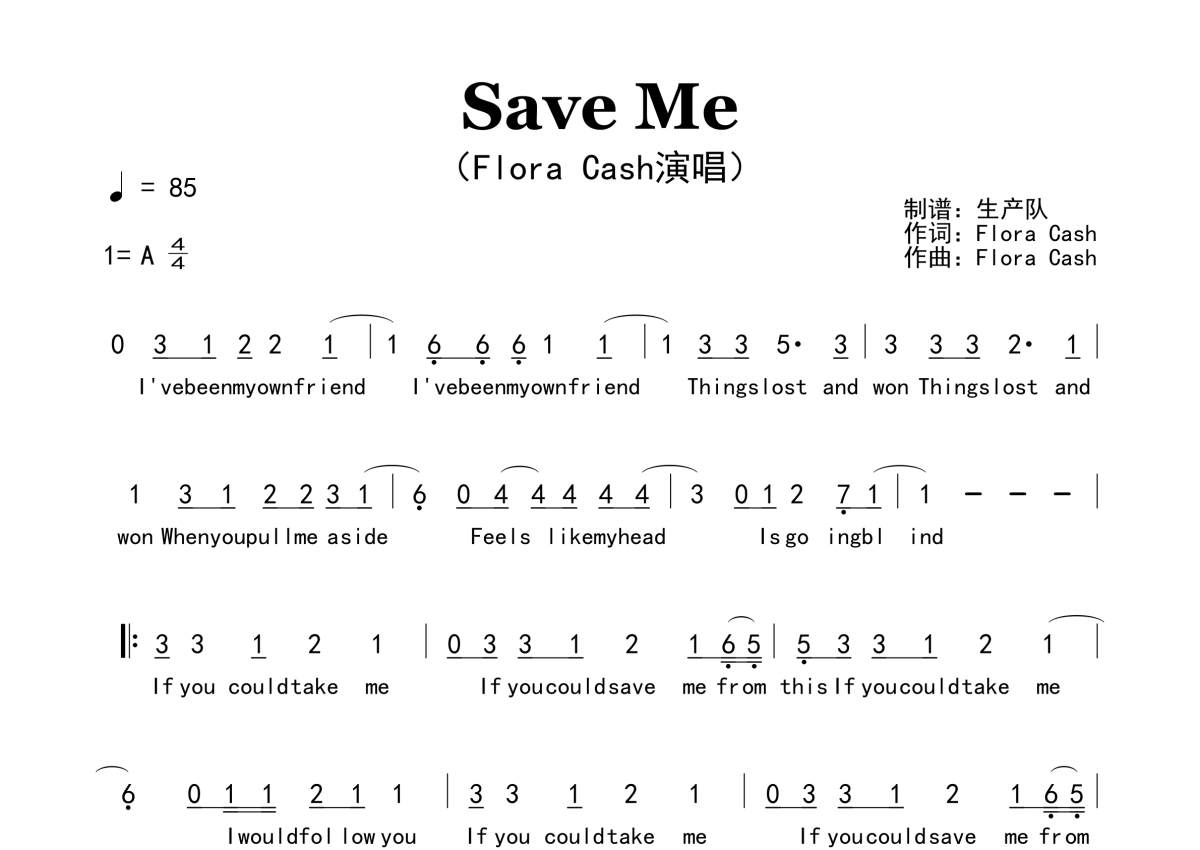 《Save Me》是Flora Cash演唱的一首歌曲,原版简谱,拍号为4/4拍,歌曲速度为每分钟85拍,这份简谱共有两张高清图谱,图谱由 @生产队 编配上传。