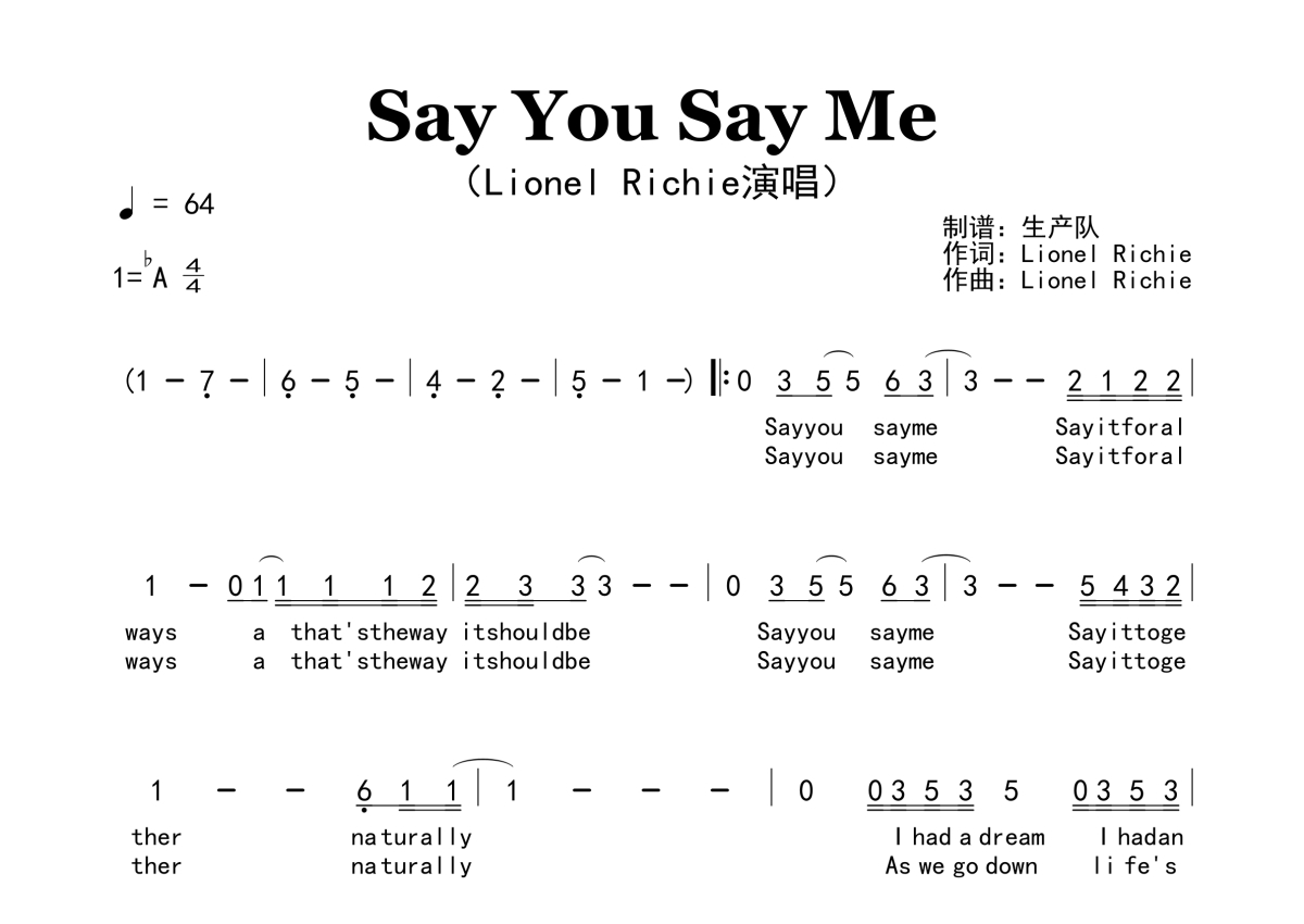 《Say You, Say Me》是Lionel Richie演唱的一首歌曲,原版简谱,拍号为4/4拍,歌曲速度为每分钟64拍,这份简谱共有两张高清图谱,图谱由 @生产队 编配上传。