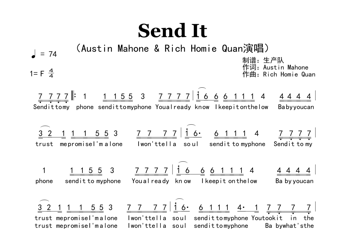 《Send It》是Austin Mahone & Rich Homie Quan演唱的一首歌曲,原版简谱,歌曲速度为每分钟74拍,这份简谱共有两张高清图谱,图谱由 @生产队 编配上传。