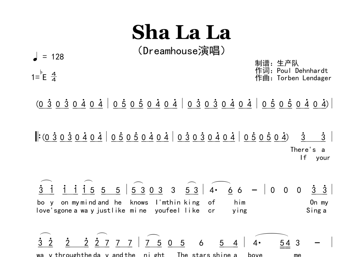 《Sha La La》是Dreamhouse演唱的一首歌曲,原版简谱,拍号为4/4拍,歌曲速度为每分钟128拍,这份简谱共有两张高清图谱,图谱由 @生产队 编配上传。