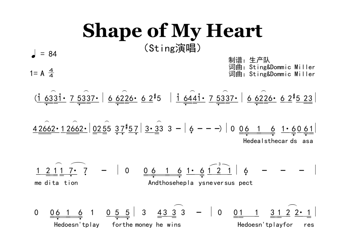 《Shape of My Heart》是Sting演唱的一首歌曲,原版简谱,拍号为4/4拍,歌曲速度为每分钟84拍,这份简谱共有两张高清图谱,图谱由 @生产队 编配上传。