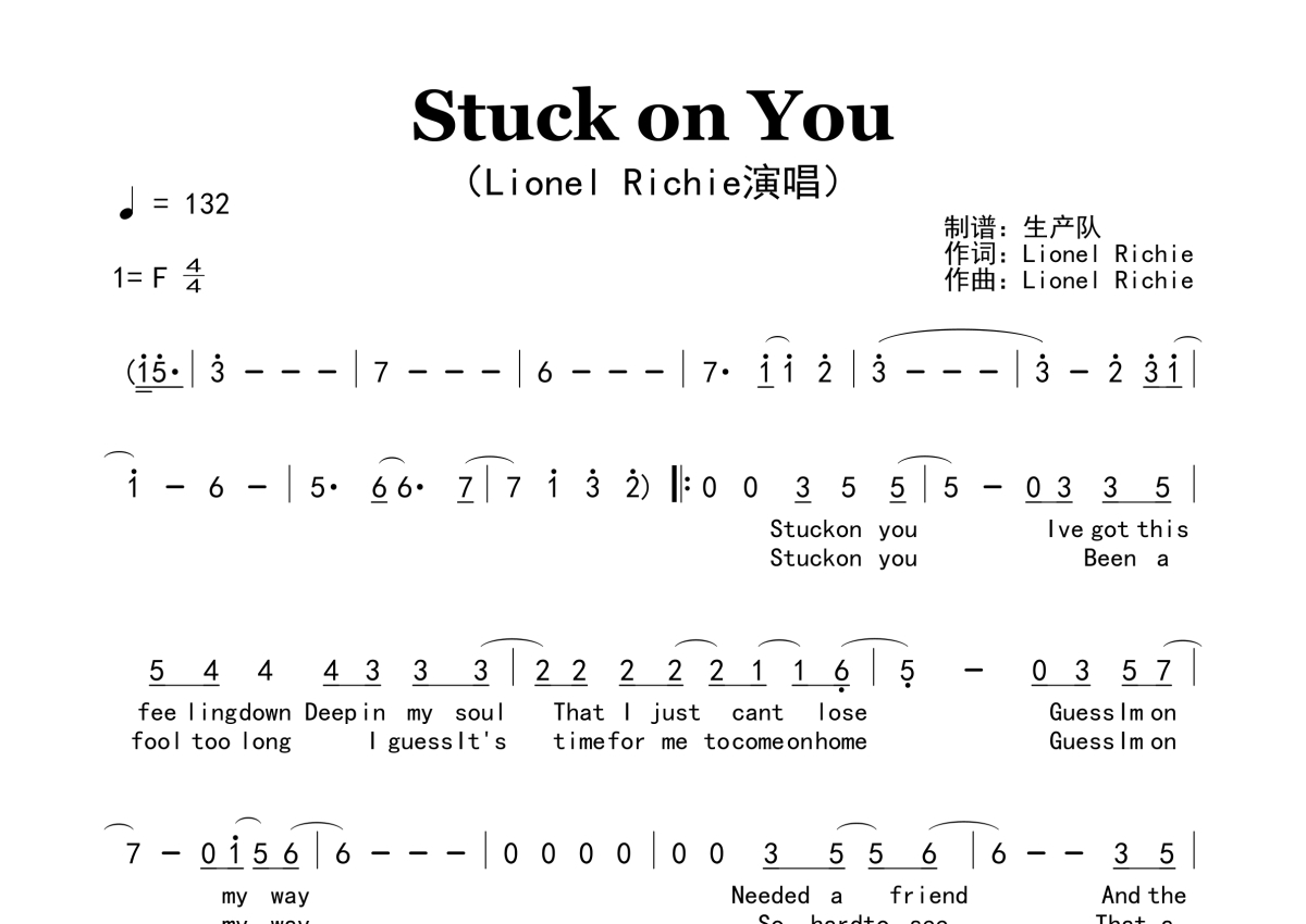 《Stuck on You》是Lionel Richie演唱的一首歌曲,原版简谱,拍号为4/4拍,歌曲速度为每分钟132拍,这份简谱共有两张高清图谱,图谱由 @生产队 编配上传。