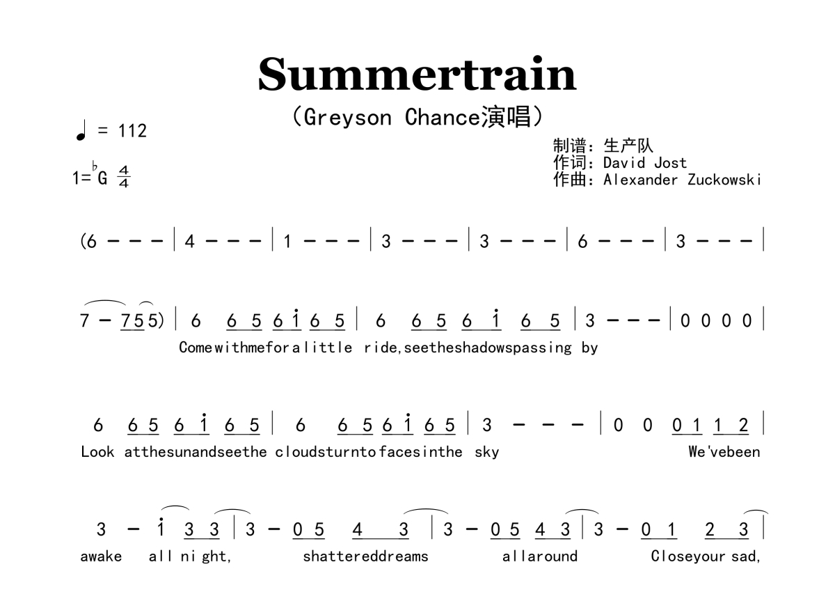 《Summertrain》是Greyson Chance演唱的一首歌曲,原版简谱,拍号为4/4拍,歌曲速度为每分钟112拍,这份简谱共有两张高清图谱,图谱由 @生产队 编配上传。