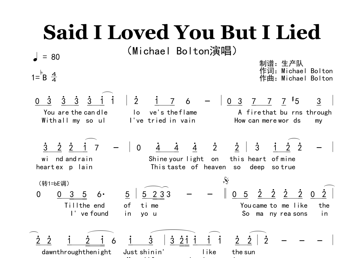 《Said I Loved You But I Lied》是Michael Bolton演唱的一首歌曲,原版简谱,拍号为4/4拍,歌曲速度为每分钟80拍,这份简谱共有一张高清图谱,图谱由 @生产队 编配上传。