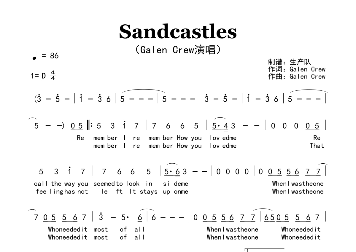 《Sandcastles》是Galen Crew演唱的一首歌曲,原版简谱,拍号为4/4拍,歌曲速度为每分钟86拍,这份简谱共有一张高清图谱,图谱由 @生产队 编配上传。