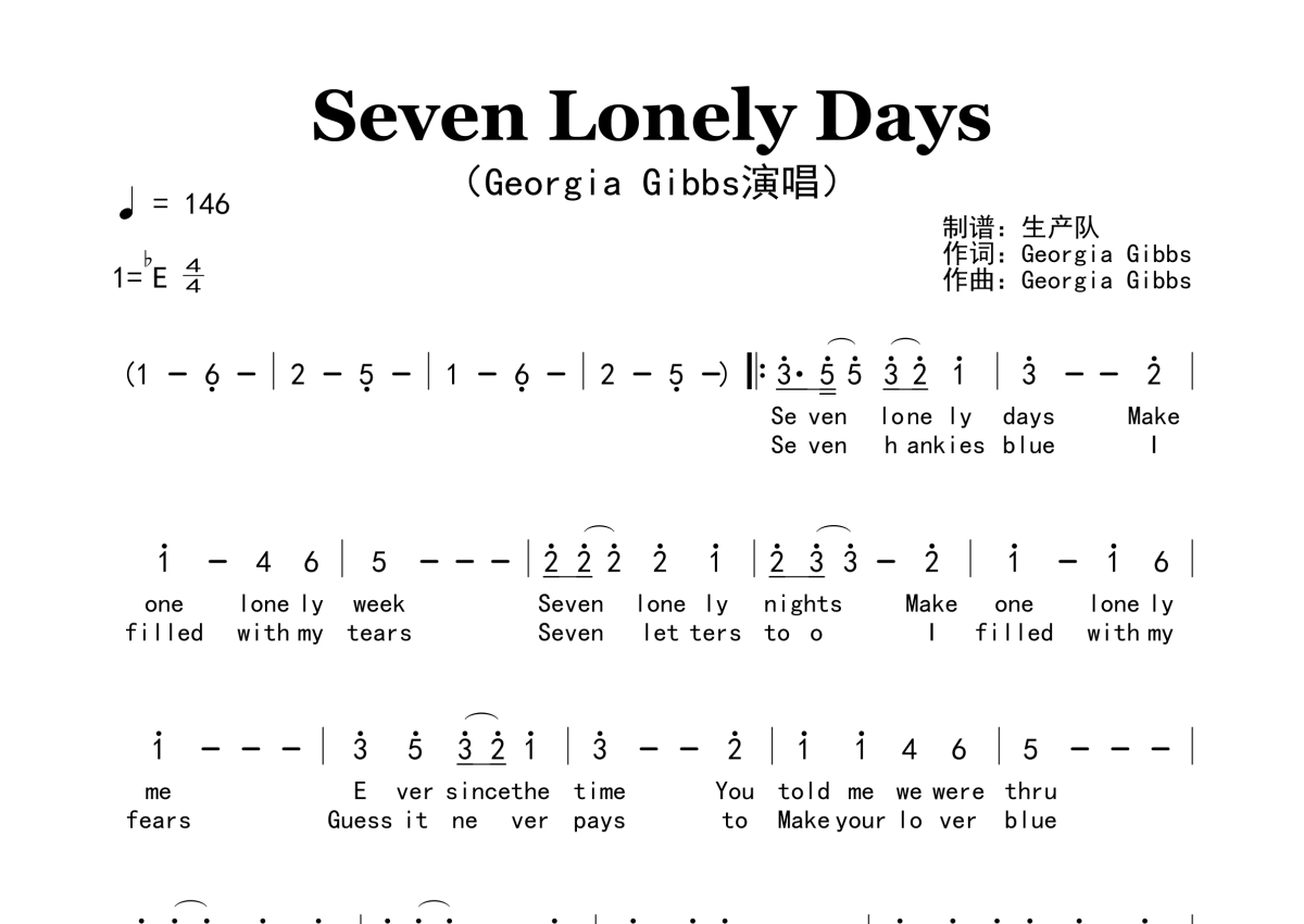 《Seven Lonely Days》是Georgia Gibbs演唱的一首歌曲,原版简谱,拍号为4/4拍,歌曲速度为每分钟146拍,这份简谱共有一张高清图谱,图谱由 @生产队 编配上传。