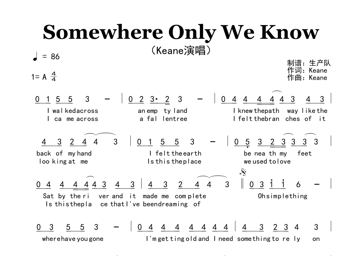 《Somewhere Only We Know》是Keane演唱的一首歌曲,原版简谱,拍号为4/4拍,歌曲速度为每分钟86拍,这份简谱共有一张高清图谱,图谱由 @生产队 编配上传。
