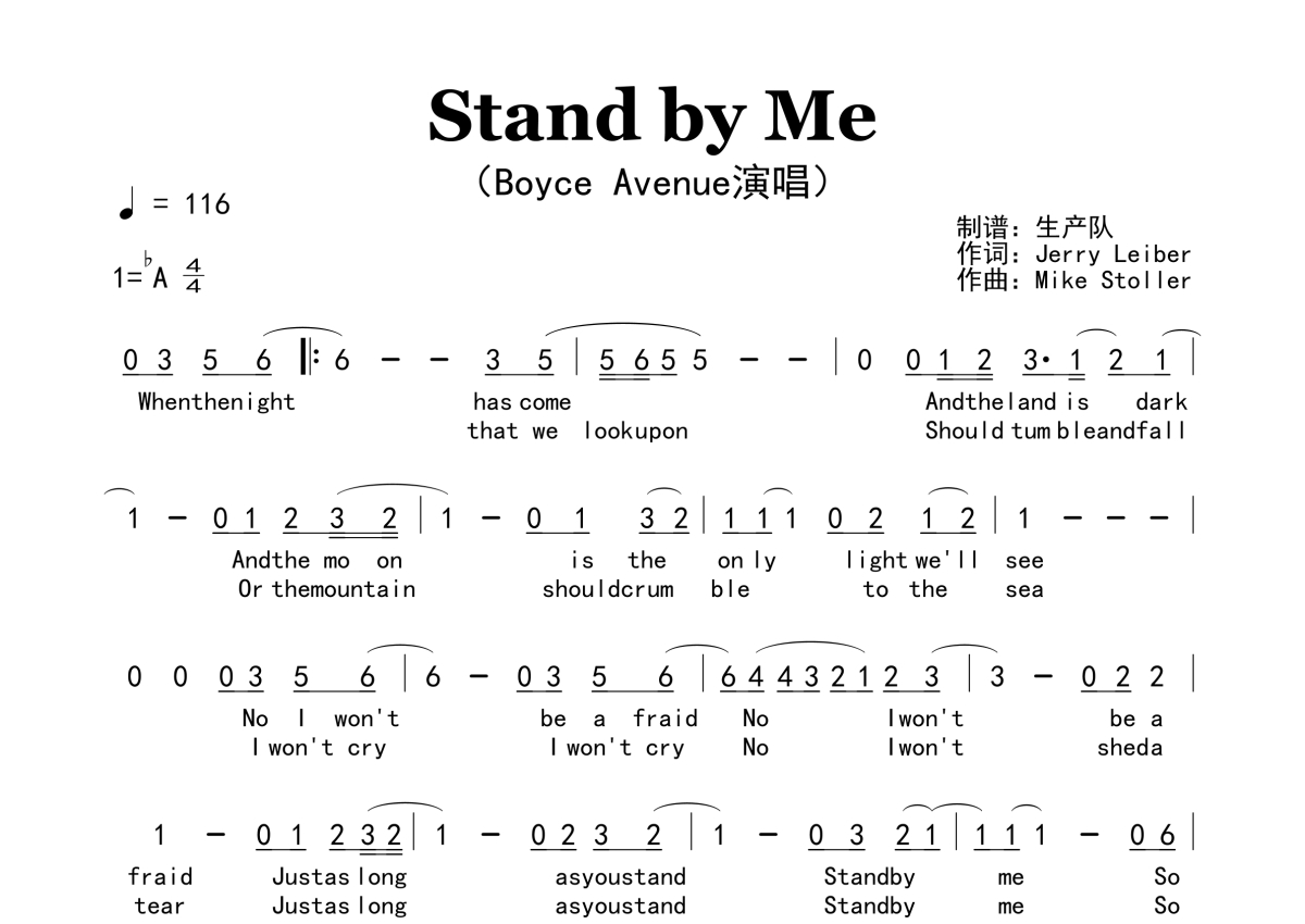 《Stand by Me》是Boyce Avenue演唱的一首歌曲,原版简谱,拍号为4/4拍,歌曲速度为每分钟116拍,这份简谱共有一张高清图谱,图谱由 @生产队 编配上传。