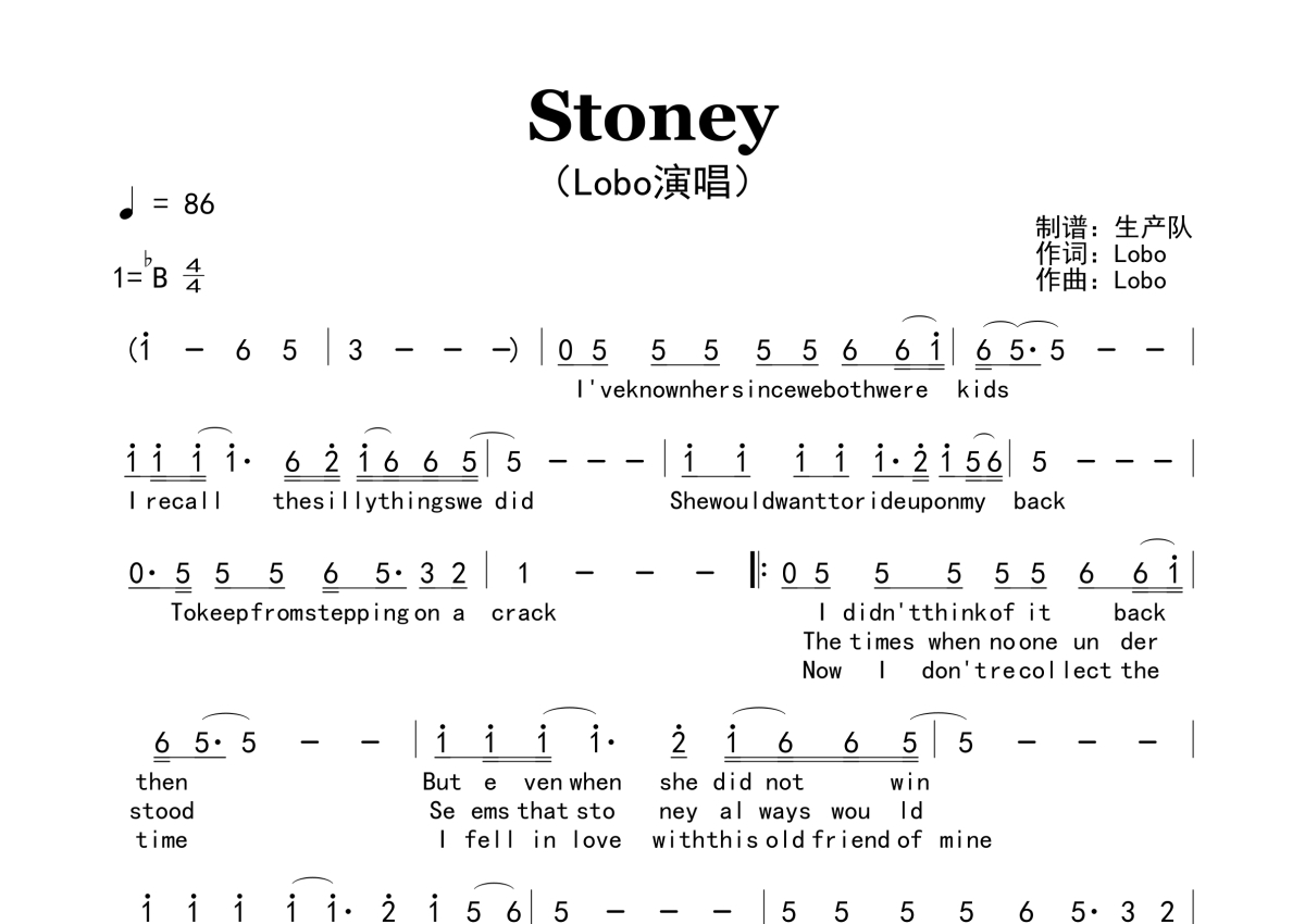 《Stoney》是Lobo演唱的一首歌曲,原版简谱,拍号为4/4拍,歌曲速度为每分钟86拍,这份简谱共有一张高清图谱,图谱由 @生产队 编配上传。