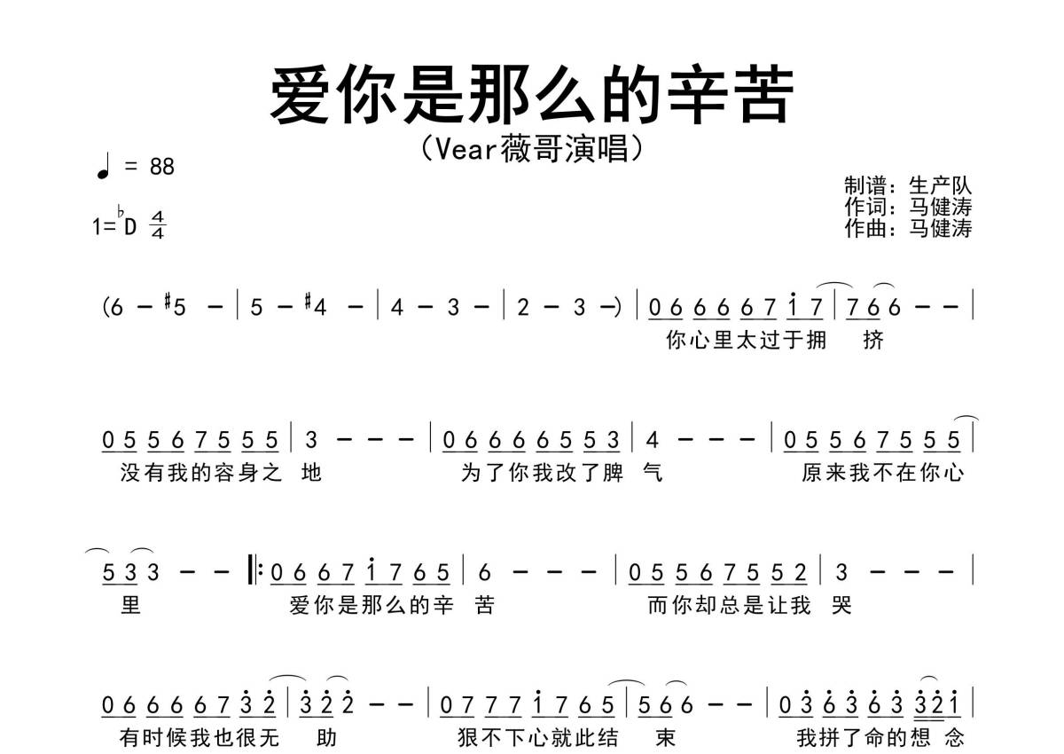 《爱你是那么的辛苦》是Vear薇哥演唱的一首歌曲,原版简谱,拍号为4/4拍,歌曲速度为每分钟88拍,这份简谱共有一张高清图谱,图谱由 @生产队 编配上传。