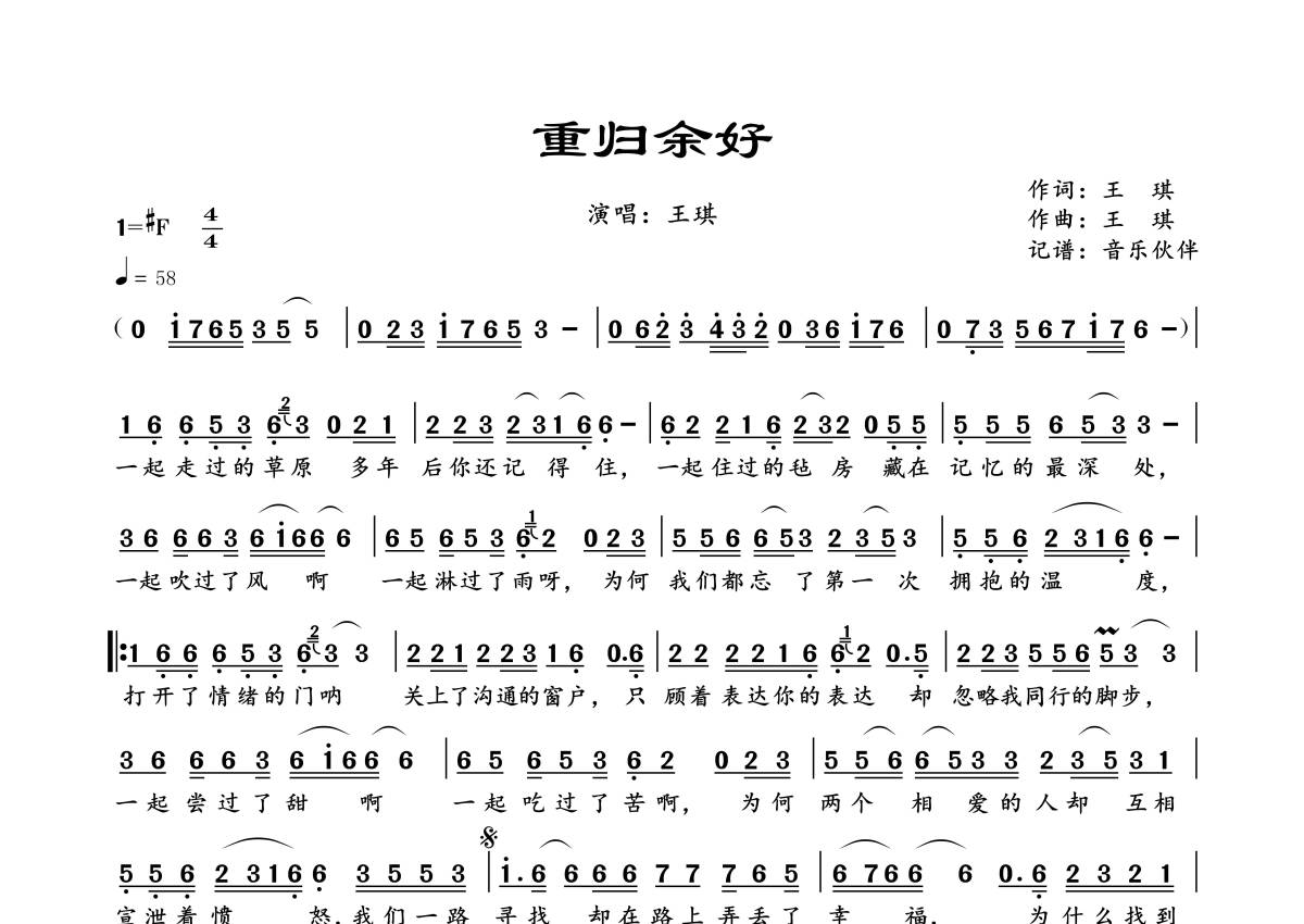 《重归余好》是王琪演唱的一首歌曲,拍号为4/4拍,歌曲速度为每分钟58拍,这份简谱共有一张高清图谱,图谱由 @音乐伙伴 编配上传。