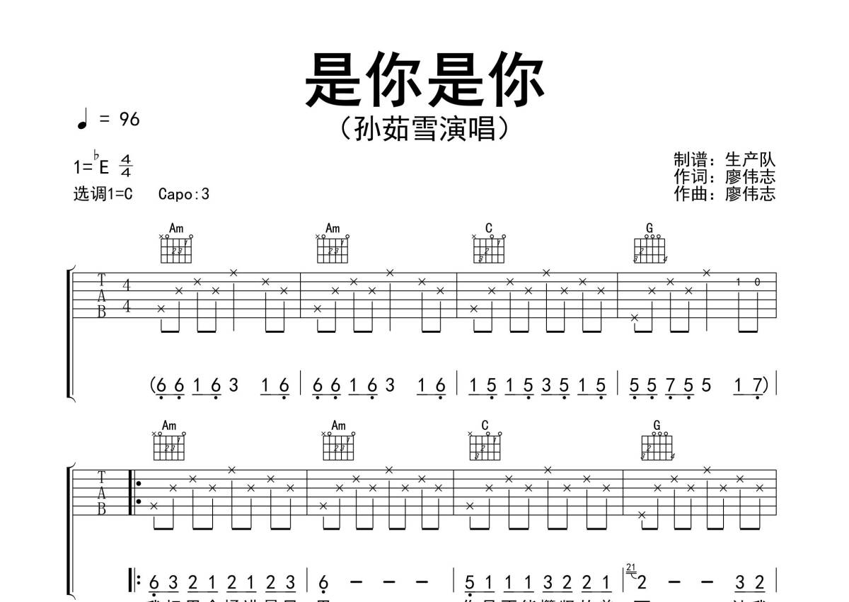 《是你是你》是孙茹雪演唱的一首歌曲,精编完美版,拍号为4/4拍,歌曲速度为每分钟96拍,歌曲原调为Eb调,但由于原调指法比较难,为了方便弹奏,本吉他谱采用的是C调指法编配,变调夹3品弹奏即为原调,当然也可以根据自己的音域改变变调夹位置,或者通过改变和弦调性,以方便自己弹奏,这份吉他谱共有三张高清图谱,图谱由 @生产队 编配上传,图谱使用六线谱编配,包含吉他和弦指法、简谱以及歌词部分,使用这份是你是你吉他谱,可以让你更加方便地掌握这首歌曲的弹唱技巧,快来尝试吧。