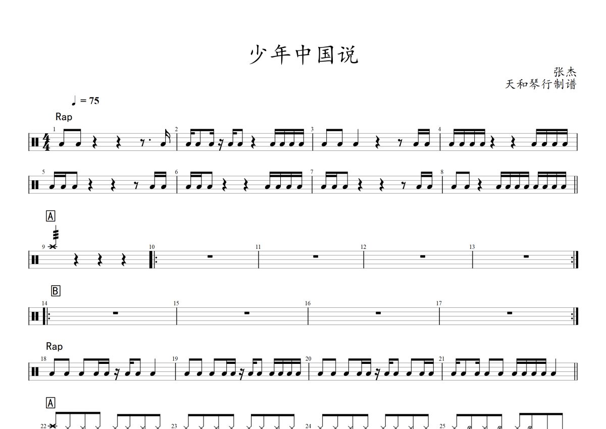 《少年中国说》是张杰演唱的一首歌曲,拍号为4/4拍,歌曲速度为每分钟75拍,这份架子鼓谱共有两张高清图谱,图谱由 @音符喷血者 编配上传,图谱使用五线谱编配,使用这份少年中国说架子鼓谱,你将能够轻松地敲打出这首张杰的少年中国说,快来尝试吧。