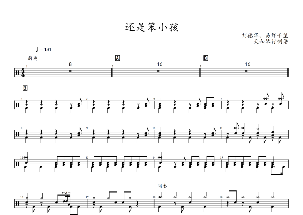《还是笨小孩》是刘德华/易烊千玺演唱的一首歌曲,拍号为4/4拍,歌曲速度为每分钟131拍,这份架子鼓谱共有两张高清图谱,图谱由 @音符喷血者 编配上传,图谱使用五线谱编配,使用这份还是笨小孩架子鼓谱,你将能够轻松地敲打出这首刘德华/易烊千玺的还是笨小孩,快来尝试吧。