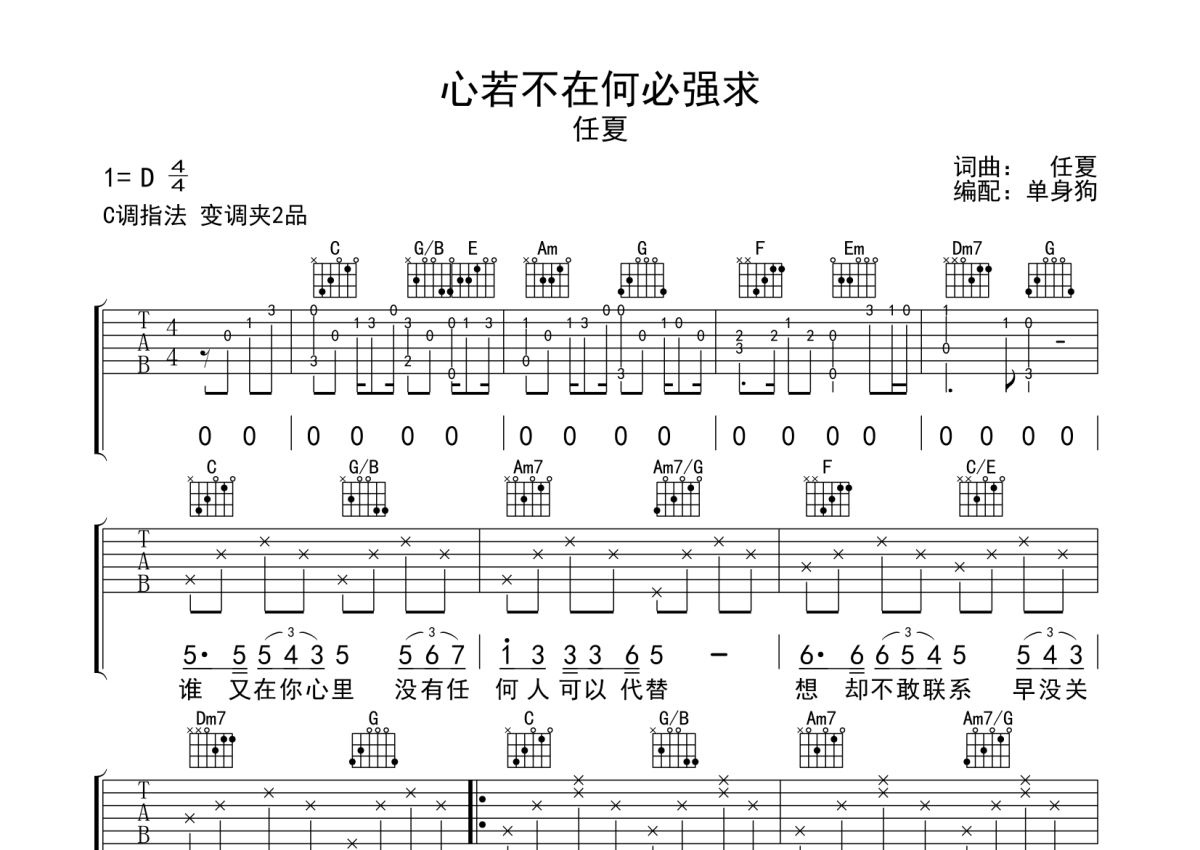 任夏《心若不在何必强求》吉他谱 - C调弹唱六线谱