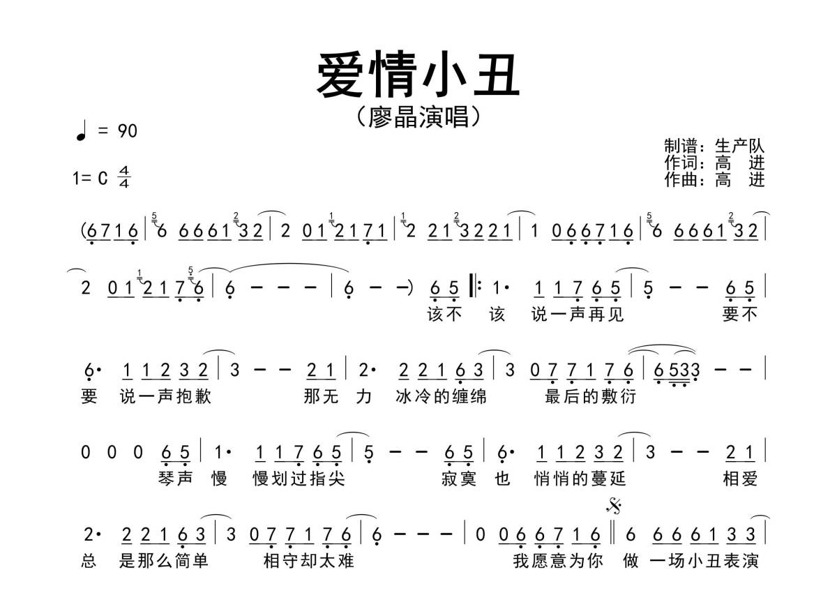 《爱情小丑》是廖晶演唱的一首歌曲,原版简谱,拍号为4/4拍,歌曲速度为每分钟90拍,这份简谱共有一张高清图谱,图谱由 @生产队 编配上传。