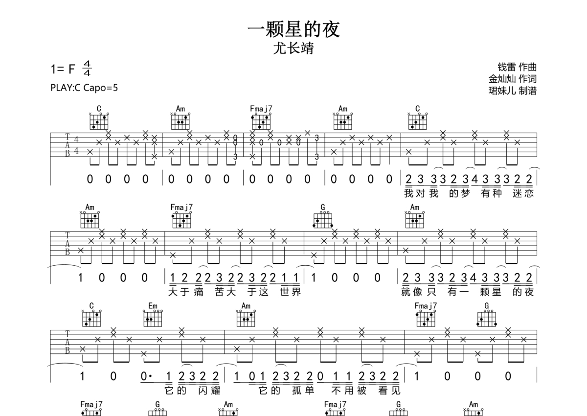 《一颗星的夜》是尤长靖演唱的一首歌曲,拍号为4/4拍,歌曲速度为每分钟85拍,歌曲原调为F调,但由于原调指法比较难,为了方便弹奏,本吉他谱采用的是C调指法编配,变调夹5品弹奏即为原调,当然也可以根据自己的音域改变变调夹位置,或者通过改变和弦调性,以方便自己弹奏,这份吉他谱共有三张高清图谱,图谱由 @珺妹儿 编配上传,图谱使用六线谱编配,包含吉他和弦指法、简谱以及歌词部分,使用这份一颗星的夜吉他谱,可以让你更加方便地掌握这首歌曲的弹唱技巧,快来尝试吧。
