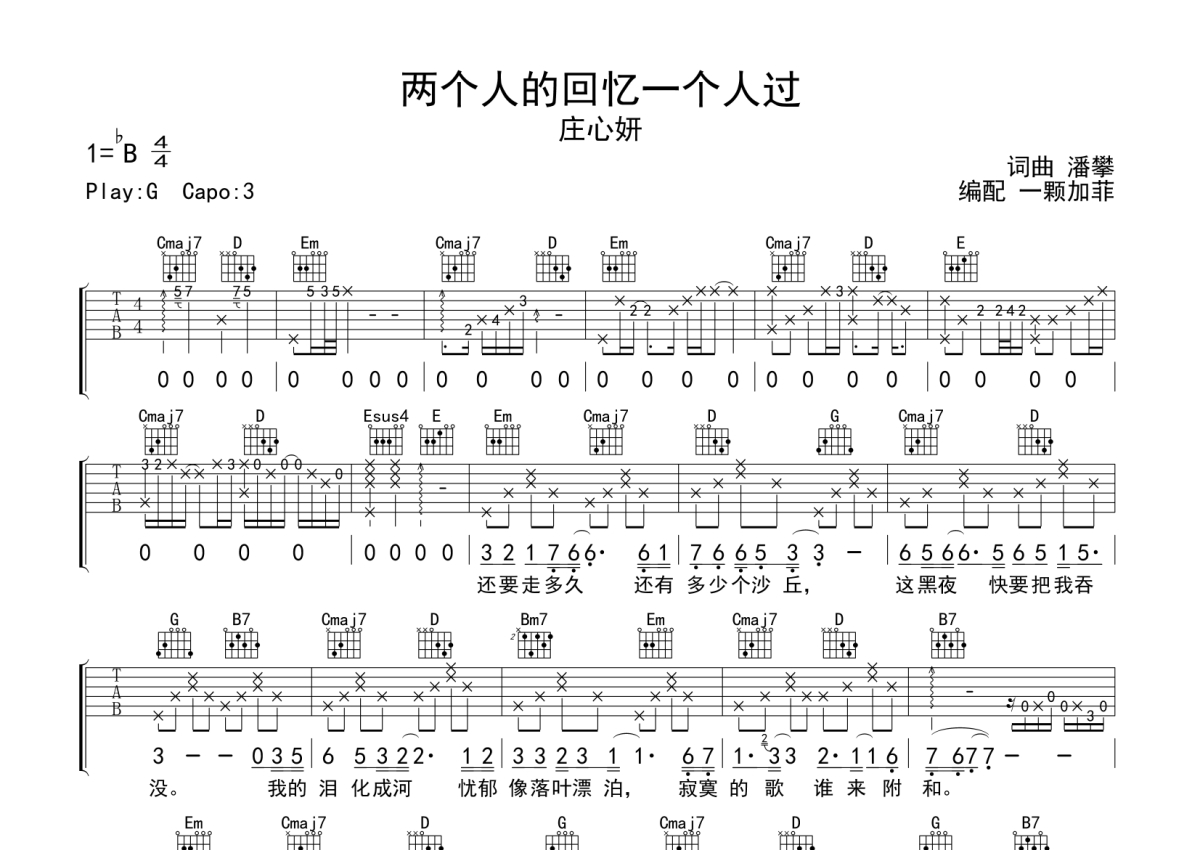 《两个人的回忆一个人过》是庄心妍演唱的一首歌曲,本吉他谱采用的是G调指法编配,这份吉他谱共有两张高清图谱,图谱由 @一颗加菲 编配上传,图谱使用六线谱编配,包含吉他和弦指法、简谱以及歌词部分,曲谱配备了相关的音频提供试听,使用这份两个人的回忆一个人过吉他谱,可以让你更加方便地掌握这首歌曲的弹唱技巧,快来尝试吧。