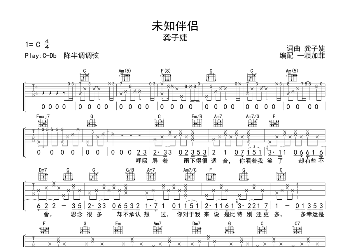 龚子婕《未知伴侣》吉他谱 - C调弹唱六线谱