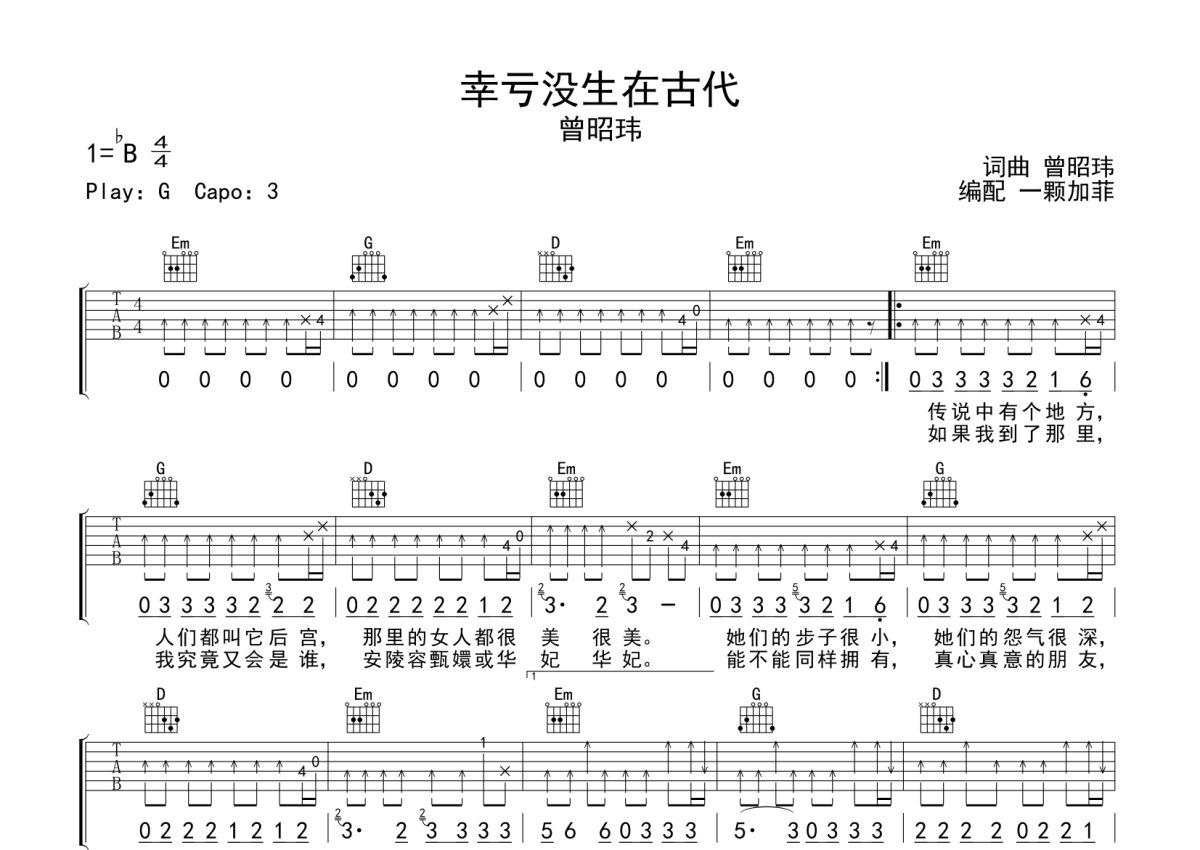 曾昭玮《幸亏没生在古代》吉他谱 - G调弹唱六线谱