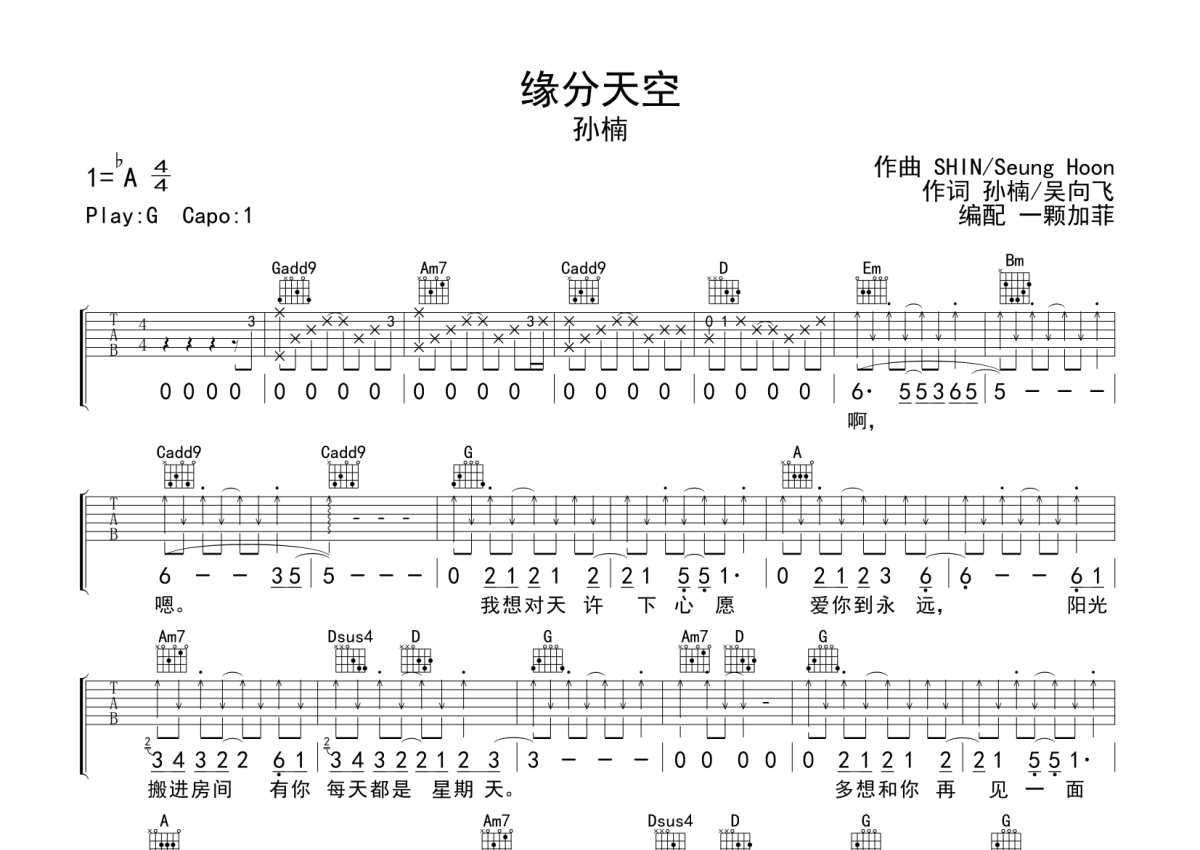 《缘分天空》是孙楠演唱的一首歌曲,本吉他谱采用的是G调指法编配,这份吉他谱共有两张高清图谱,图谱由 @一颗加菲 编配上传,图谱使用六线谱编配,包含吉他和弦指法、简谱以及歌词部分,曲谱配备了相关的音频提供试听,使用这份缘分天空吉他谱,可以让你更加方便地掌握这首歌曲的弹唱技巧,快来尝试吧。