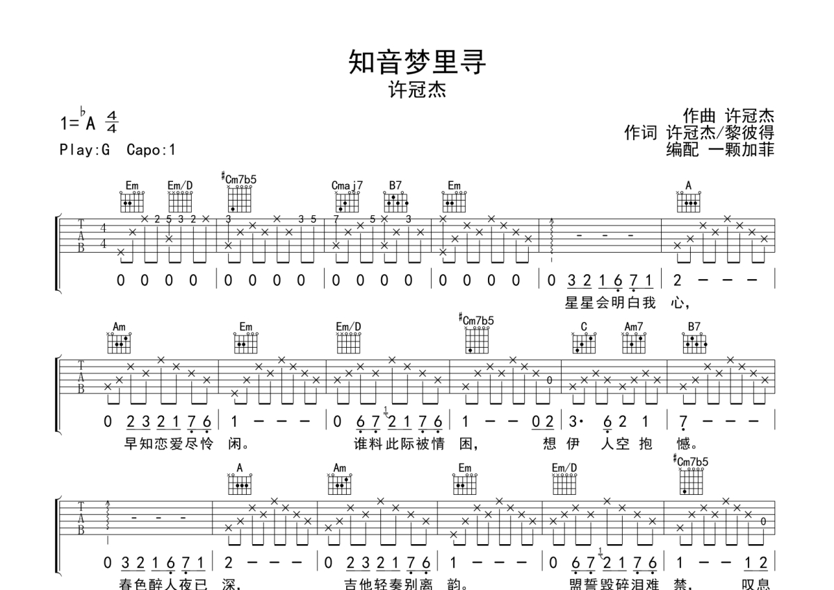 《知音梦里寻》是许冠杰演唱的一首歌曲,本吉他谱采用的是G调指法编配,这份吉他谱共有两张高清图谱,图谱由 @一颗加菲 编配上传,图谱使用六线谱编配,包含吉他和弦指法、简谱以及歌词部分,曲谱配备了相关的音频提供试听,使用这份知音梦里寻吉他谱,可以让你更加方便地掌握这首歌曲的弹唱技巧,快来尝试吧。