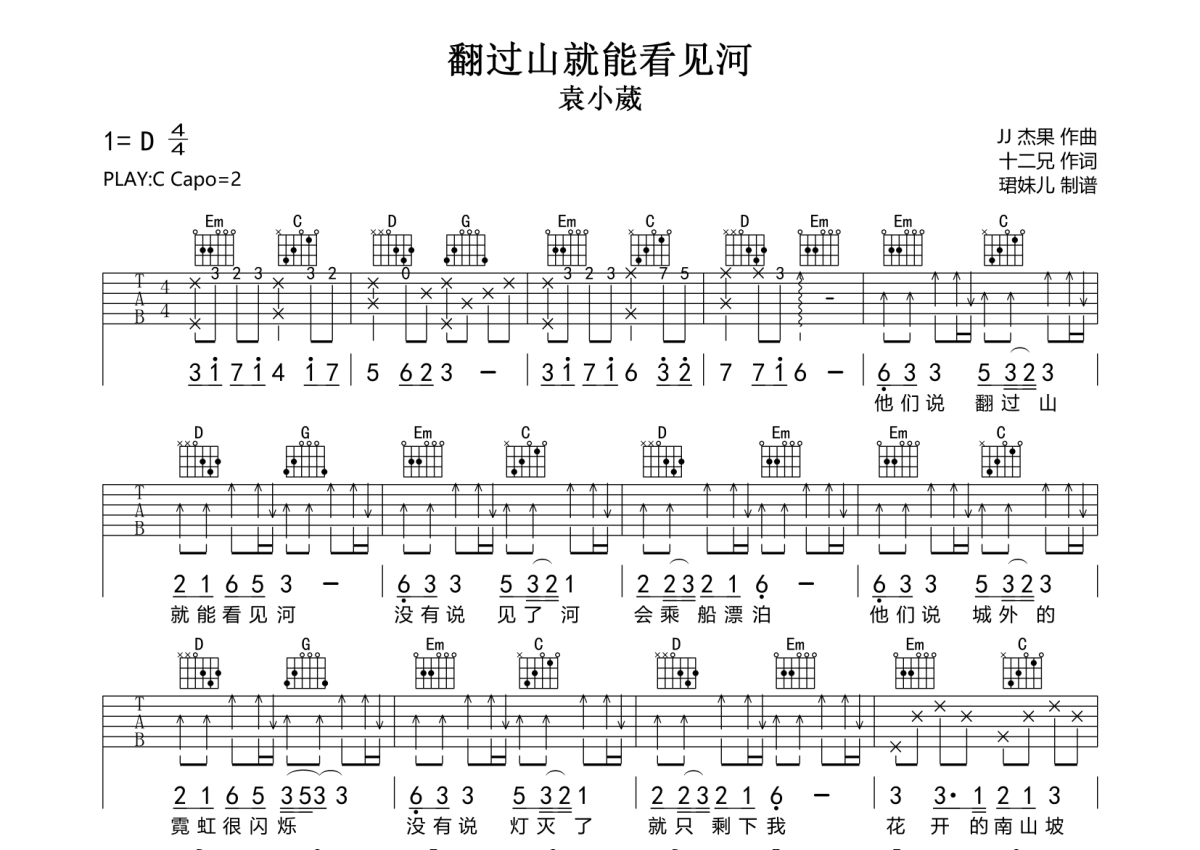 《翻过山就能看见河》是袁小葳演唱的一首歌曲,拍号为4/4拍,歌曲速度为每分钟85拍,歌曲原调为D调,但由于原调指法比较难,为了方便弹奏,本吉他谱采用的是C调指法编配,变调夹2品弹奏即为原调,当然也可以根据自己的音域改变变调夹位置,或者通过改变和弦调性,以方便自己弹奏,这份吉他谱共有两张高清图谱,图谱由 @珺妹儿 编配上传,图谱使用六线谱编配,包含吉他和弦指法、简谱以及歌词部分,使用这份翻过山就能看见河吉他谱,可以让你更加方便地掌握这首歌曲的弹唱技巧,快来尝试吧。