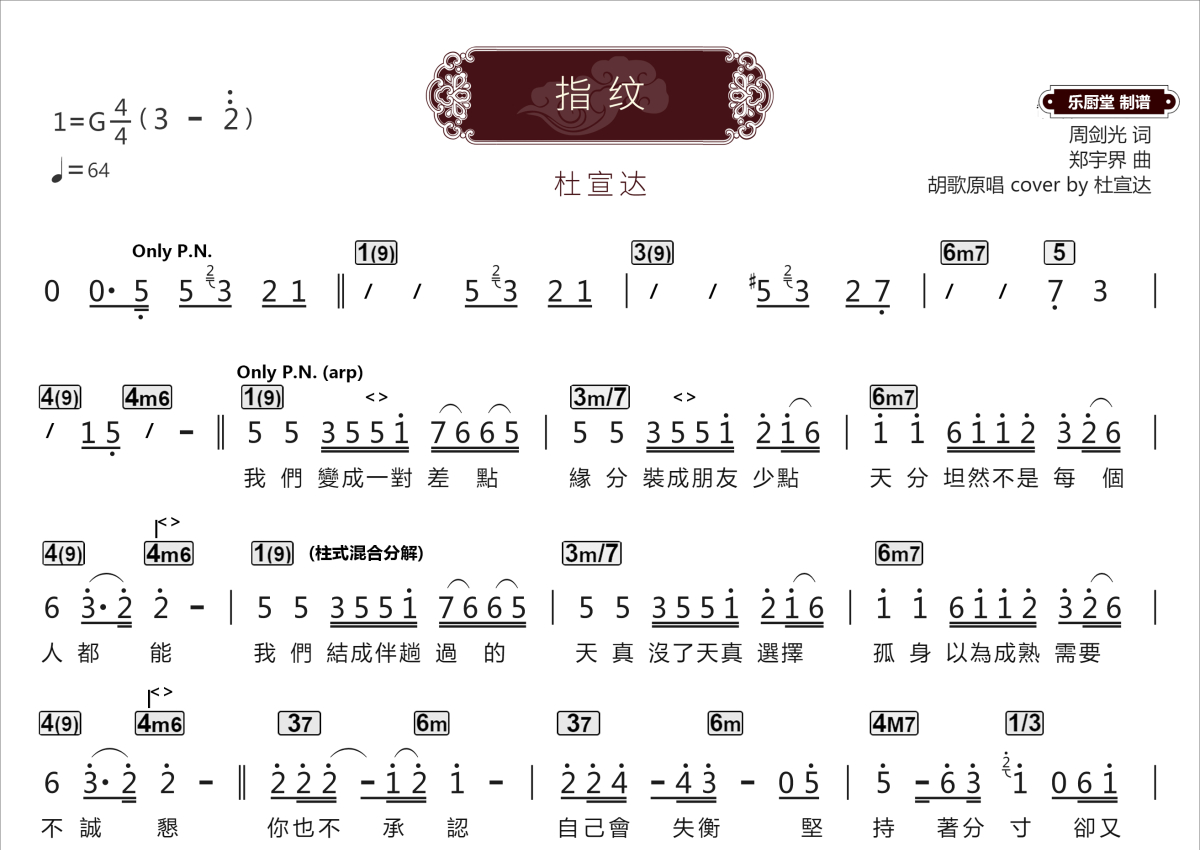 《指纹》是杜宣达演唱的一首歌曲,拍号为4/4拍,这份乐队总谱共有两张高清图谱,图谱由 @乐厨堂 编配上传职业LIVE乐手伴奏谱,适合乐队和歌手排练参考以及原版即兴伴奏。