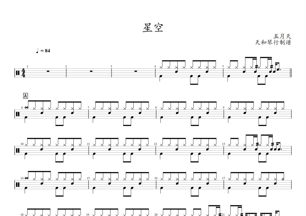 《星空》是五月天演唱的一首歌曲,拍号为4/4拍,歌曲速度为每分钟84拍,这份架子鼓谱共有三张高清图谱,图谱由 @音符喷血者 编配上传,图谱使用五线谱编配,使用这份星空架子鼓谱,你将能够轻松地敲打出这首五月天的星空,快来尝试吧。