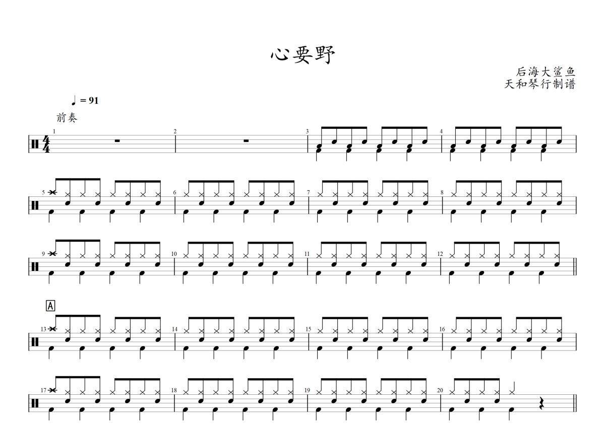 《心要野》是后海大鲨鱼演唱的一首歌曲,拍号为4/4拍,歌曲速度为每分钟91拍,这份架子鼓谱共有三张高清图谱,图谱由 @音符喷血者 编配上传,图谱使用五线谱编配,使用这份心要野架子鼓谱,你将能够轻松地敲打出这首后海大鲨鱼的心要野,快来尝试吧。