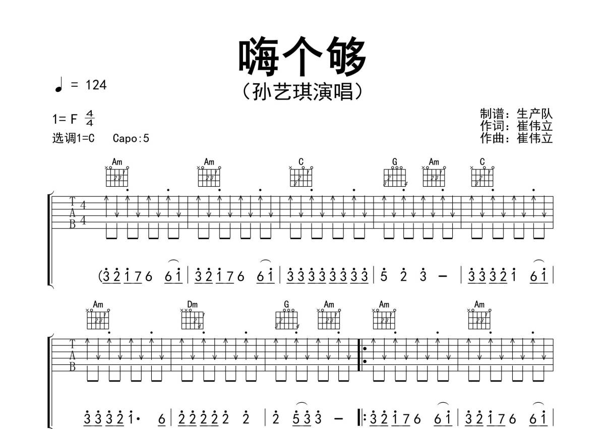 《嗨个够》是孙艺琪演唱的一首歌曲,精编完美版,拍号为4/4拍,歌曲速度为每分钟124拍,歌曲原调为C调,本吉他谱采用的是C调指法编配,变调夹5品弹奏即为原调,当然也可以根据自己的音域改变变调夹位置,或者通过改变和弦调性,以方便自己弹奏,这份吉他谱共有三张高清图谱,图谱由 @生产队 编配上传,图谱使用六线谱编配,包含吉他和弦指法、简谱以及歌词部分,使用这份嗨个够吉他谱,可以让你更加方便地掌握这首歌曲的弹唱技巧,快来尝试吧。