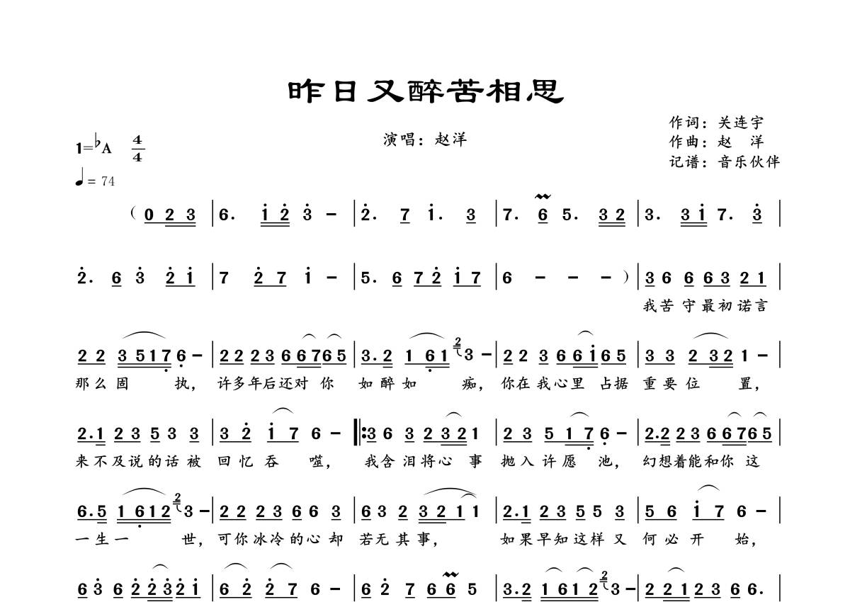 《昨日又醉苦相思》是赵洋演唱的一首歌曲,拍号为4/4拍,歌曲速度为每分钟74拍,这份简谱共有一张高清图谱,图谱由 @音乐伙伴 编配上传。