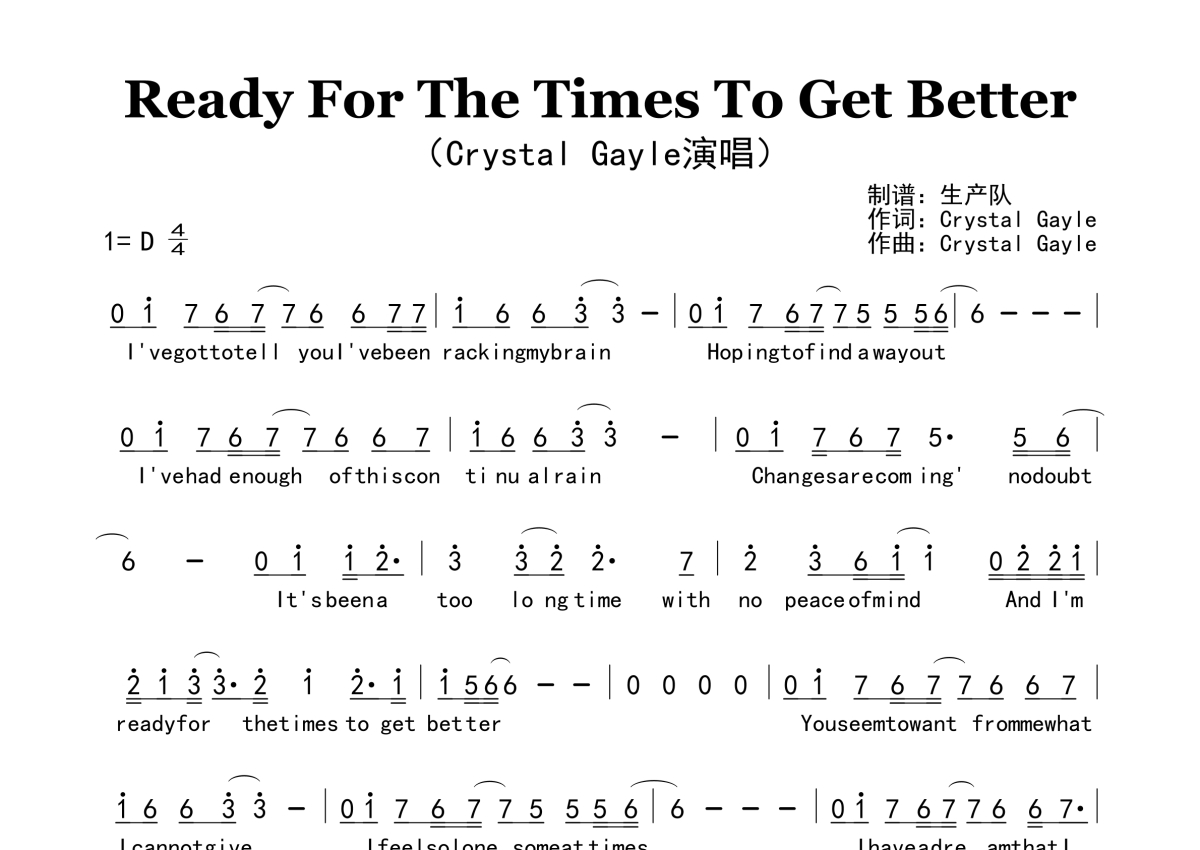 《Ready For The Times To Get Better》是Crystal Gayle演唱的一首歌曲,原版简谱,拍号为4/4拍,歌曲速度为每分钟82拍,这份简谱共有一张高清图谱,图谱由 @生产队 编配上传。