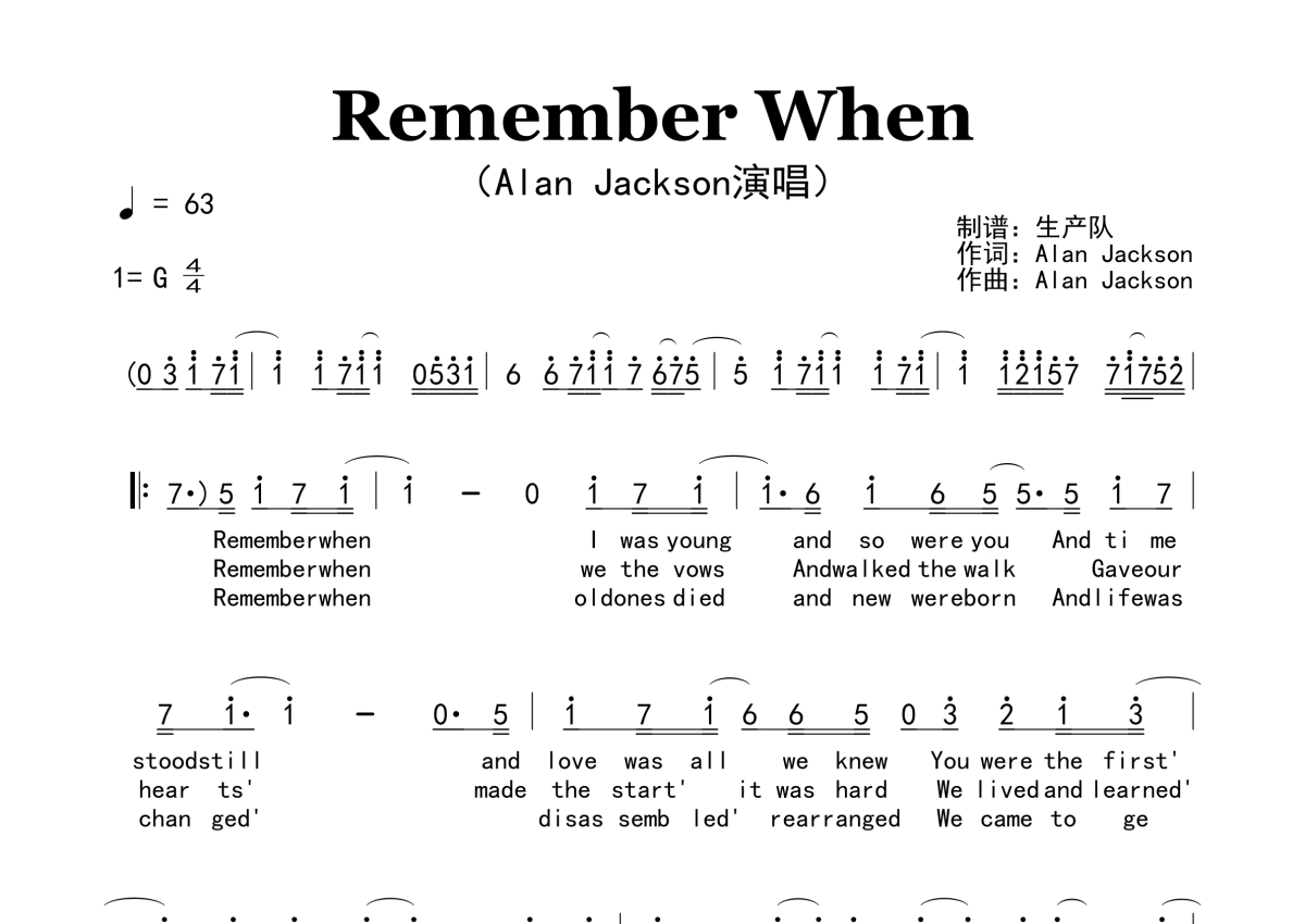 《Remember When》是Alan Jackson演唱的一首歌曲,原版简谱,拍号为4/4拍,歌曲速度为每分钟63拍,这份简谱共有两张高清图谱,图谱由 @生产队 编配上传。