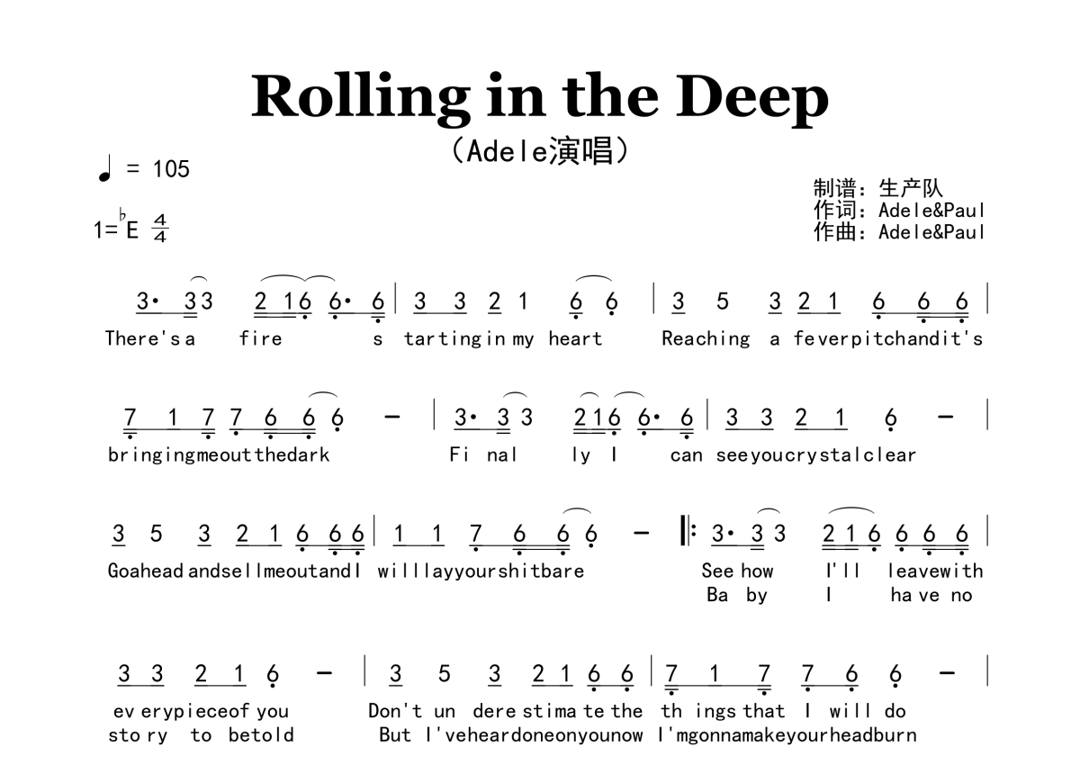《Rolling in the Deep》是Adele演唱的一首歌曲,原版简谱,拍号为4/4拍,歌曲速度为每分钟105拍,这份简谱共有两张高清图谱,图谱由 @生产队 编配上传。
