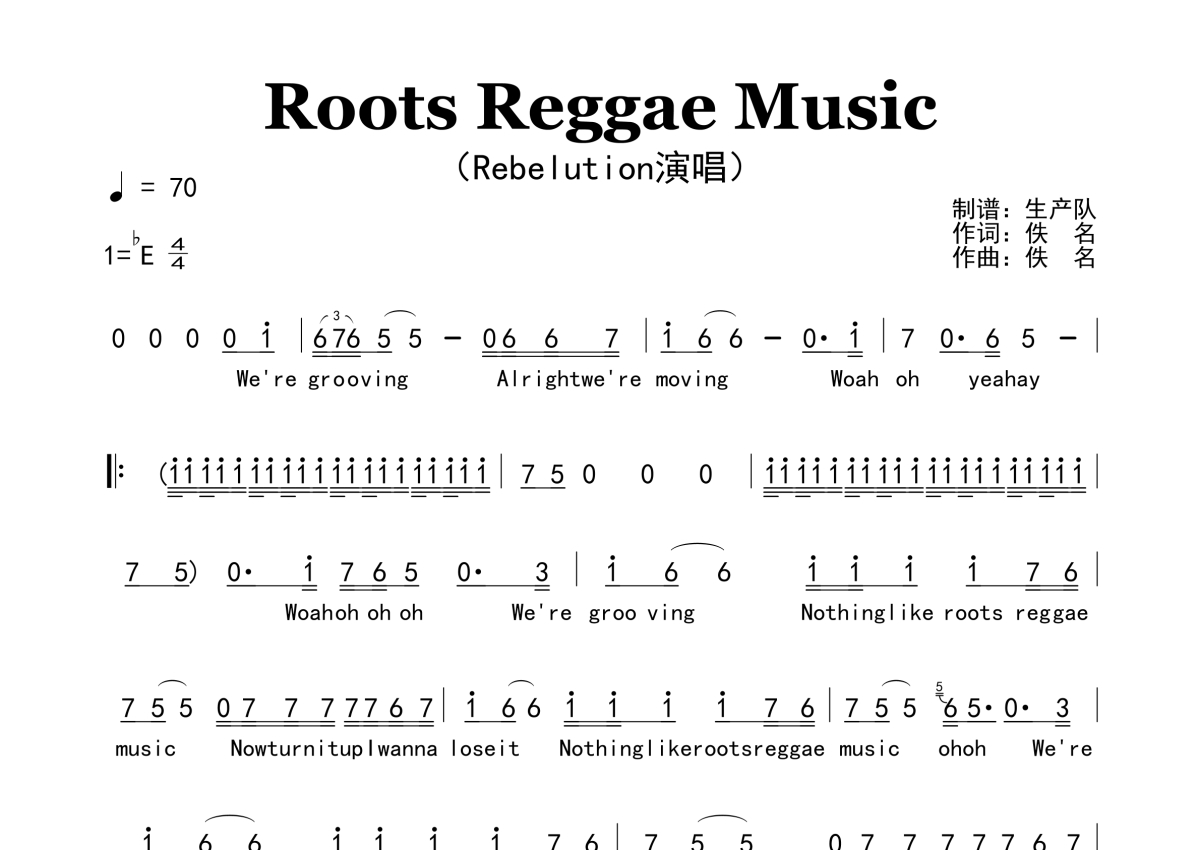 《Roots Reggae Music》是Rebelution演唱的一首歌曲,原版简谱,拍号为4/4拍,歌曲速度为每分钟70拍,这份简谱共有两张高清图谱,图谱由 @生产队 编配上传。