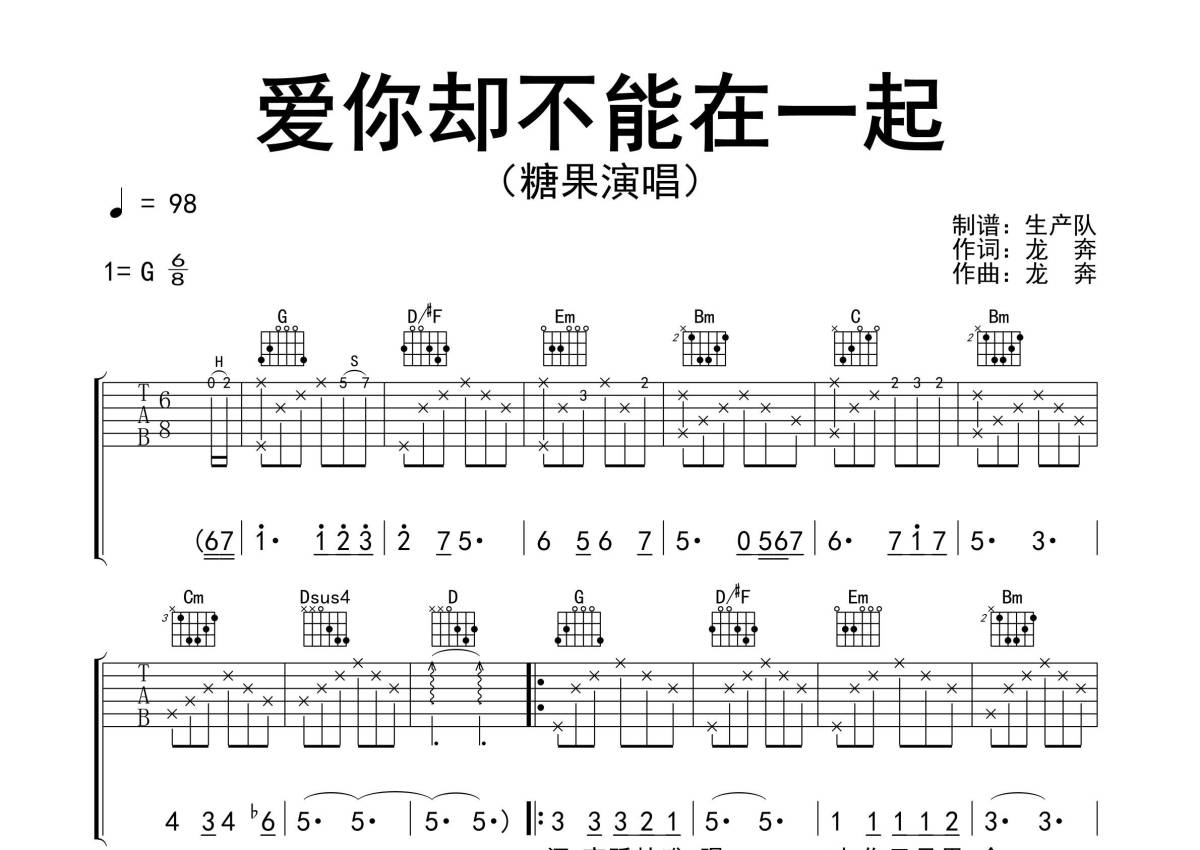 《爱你却不能在一起》是糖果演唱的一首歌曲,精编完美版,本吉他谱采用的是G调指法编配,这份吉他谱共有三张高清图谱,图谱由 @生产队 编配上传,图谱使用六线谱编配,包含吉他和弦指法、简谱以及歌词部分,使用这份爱你却不能在一起吉他谱,可以让你更加方便地掌握这首歌曲的弹唱技巧,快来尝试吧。