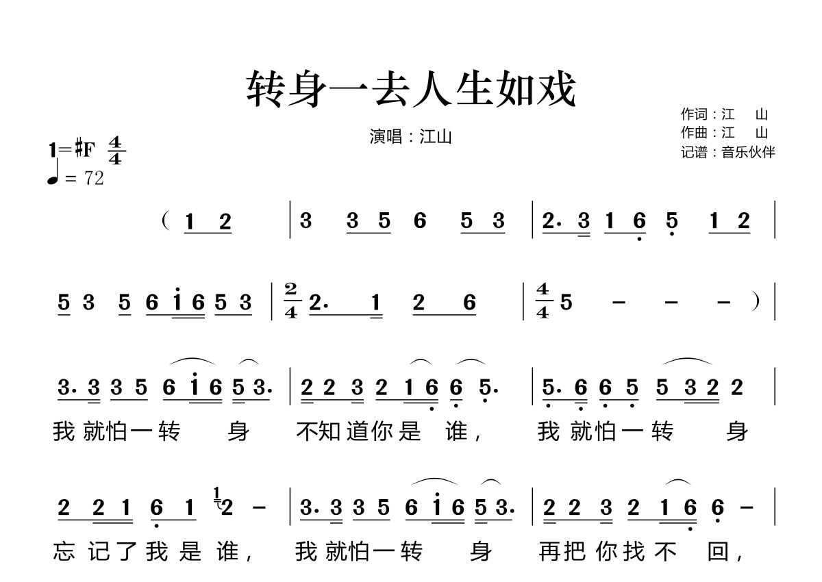 转身一去人生如戏简谱 - 江山演唱
